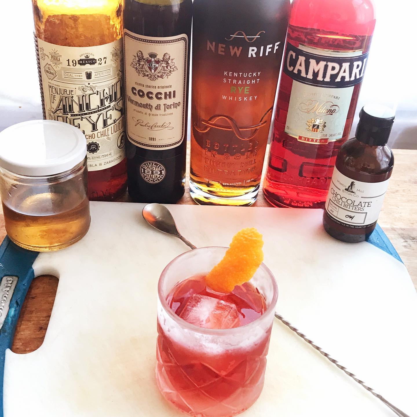 A delicious, spiced riff on a Boulevardier (and Sam Ross’s new classic Left Hand) that incorporates some complementary flavors from south of the border 🌶🍫🥃 The baking spice notes in the rye whiskey work nicely with the cocoa notes in the vermouth, the ancho chile flavor from the liqueur, the cinnamon syrup, and chili/chocolate notes of the bitters to yield a great flavor. The Campari adds bittersweet notes while also making the drink a bit lighter and the citrus aromas from the orange twist also enhance the drinking experience. An excellent sipper for before or after dinner