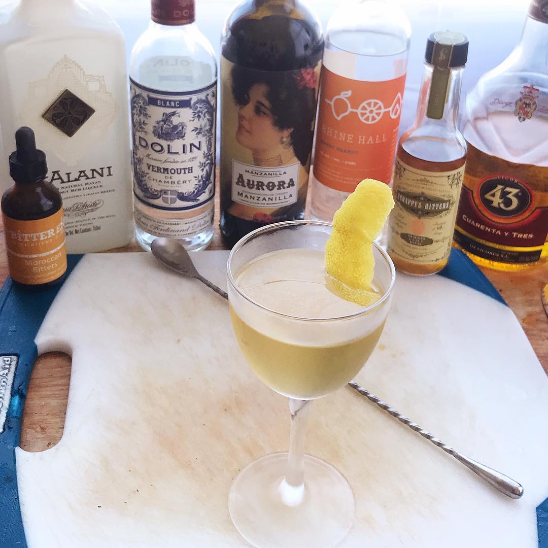 A dry, tropical low ABV martini riff that is great for sipping with dinner as you watch the sunset 🐵🎩🥭 The dry Manzanilla sherry provides notes of green apple and white wine that provide a perfect base for the ripe (but not sweet) mango flavors from the mango eau de vie. Small amounts of coconut and vanilla liqueurs provide some complementary background flavors to the mango while combining with the Blanc vermouth to give body to the drink. Lime and the sumac/lemon peel-forward Moroccan bitters tie everything together