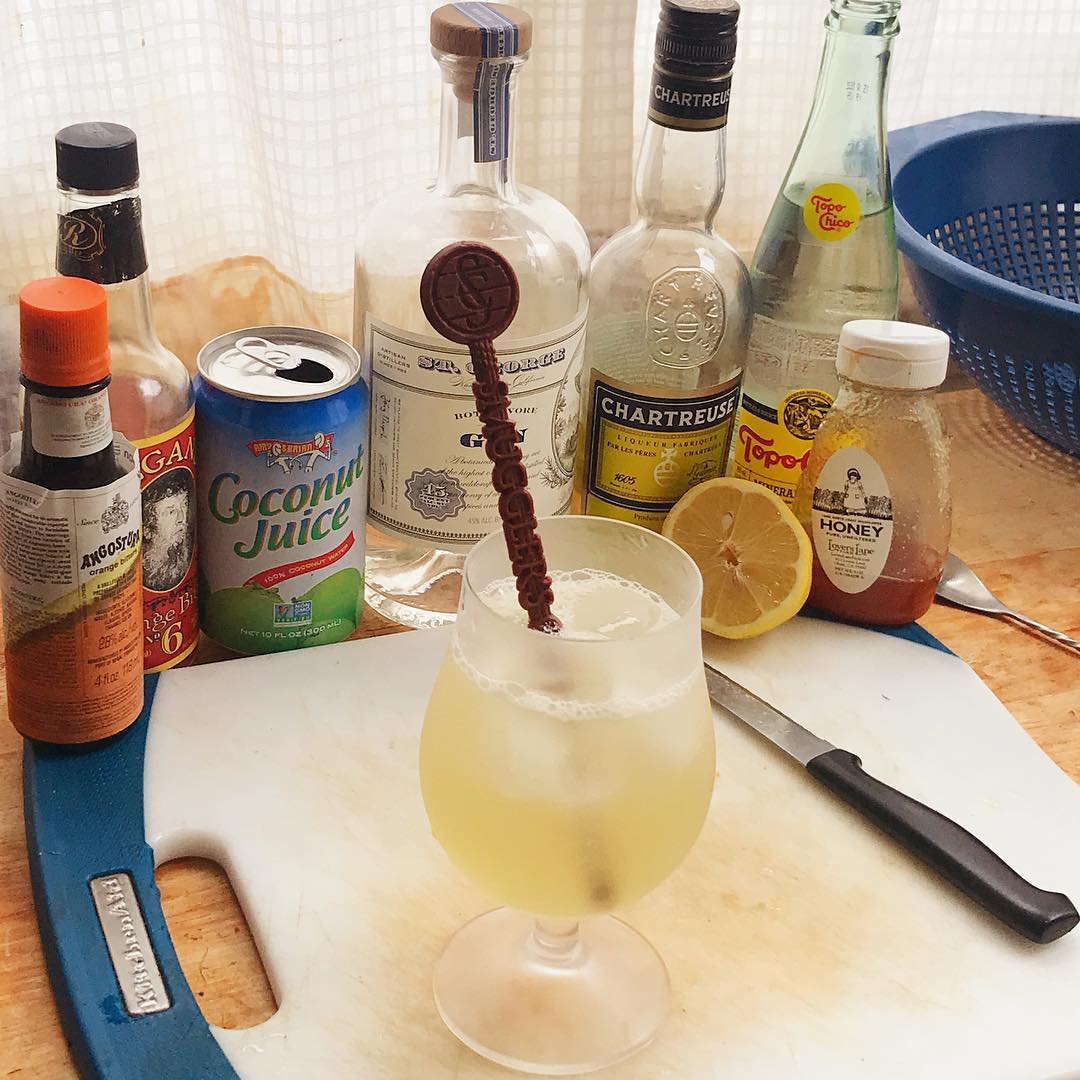 The botanical notes in the gin are echoed by the herbal sweetness of the Yellow Chartreuse and honey syrup while the coconut water takes things in a more tropical direction with some lemony citrus and soda water to lighten things