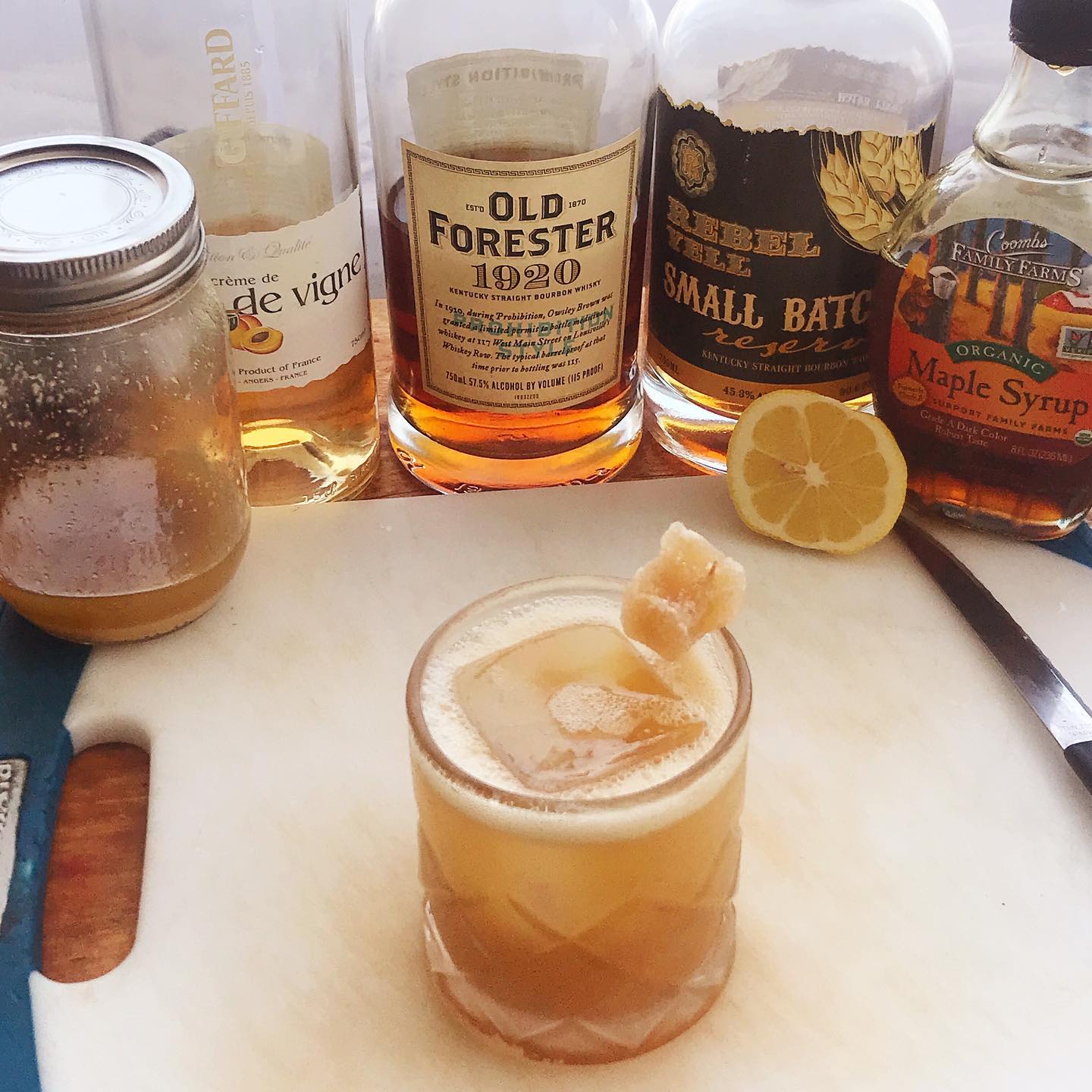 The baking spice and caramel notes in the blend of bourbons works nicely with the flavors of peach, the deep sweetness of maple syrup, and the spicy punch of ginger. The lemon juice lightens and brightens the drink.