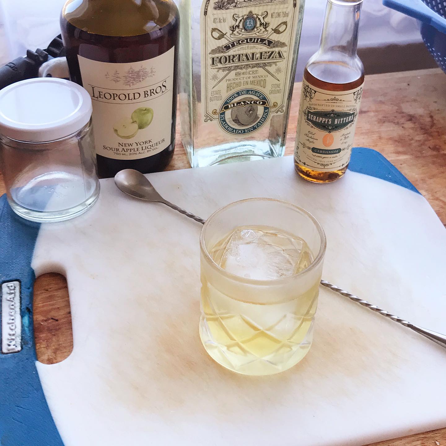 The Blanco tequila has bright notes of citrus and green vegetation that are balanced by the tannic, sweet/tart green apple liqueur while the cardamom bitters add a touch of warming spice and the essential oils from the citrus twist helps bridge the flavors