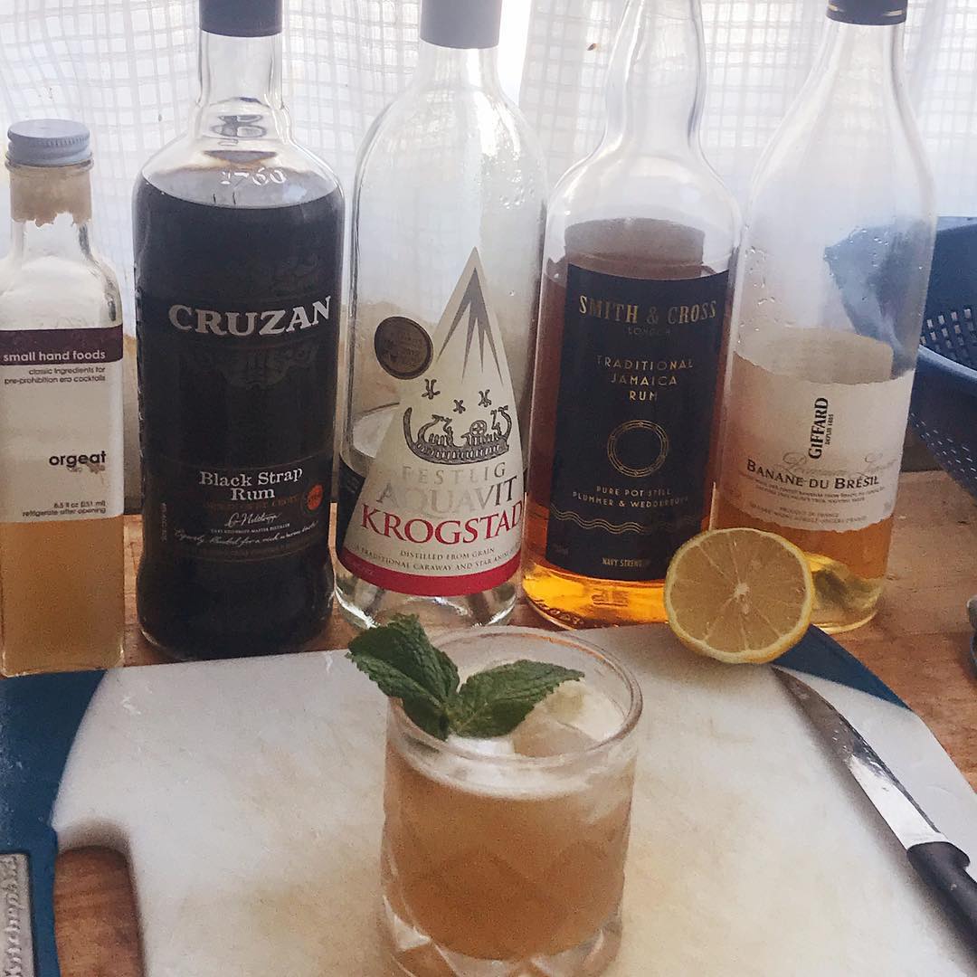 The funky overproof Jamaican rum and deeply molasses forward Black Strap Rum are balanced by the star anise and caraway flavors in the aquavit. The banana and orgeat work with the runs to give the expected tropical accents one would expect from the Mai Tai
