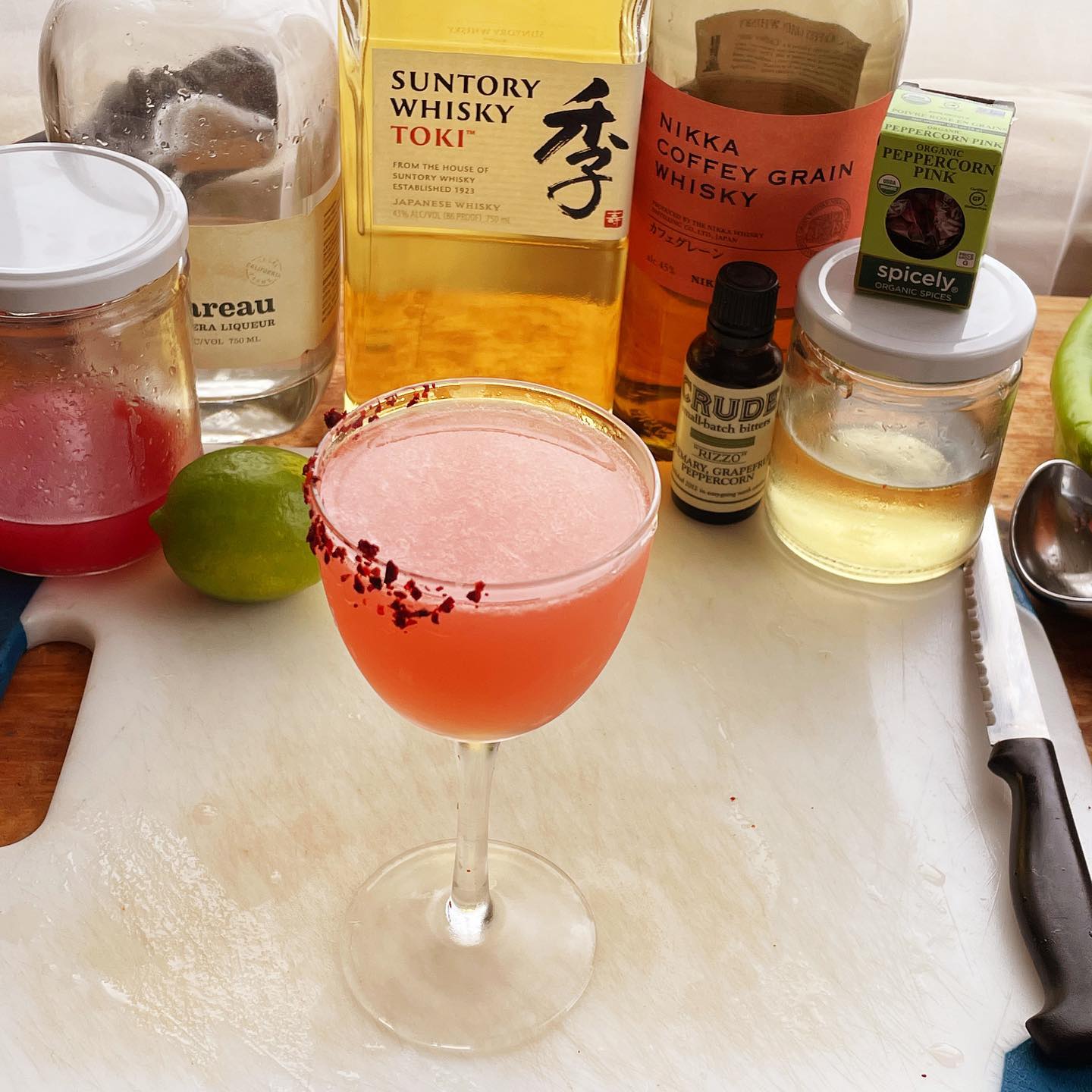 The Japanese blended malt and Japanese grain whisky combine to form a base with subtle honey and floral notes that provide a nice canvas for the melon notes from the fresh watermelon juice and the aloe liqueur. The pink peppercorn syrup lends a bit of spice with fruit notes that combines with the dash of bitters and the pink peppercorn/Korean chile rim to add a touch of spice while the lime juice brightens the drink and brings some balancing acidity
