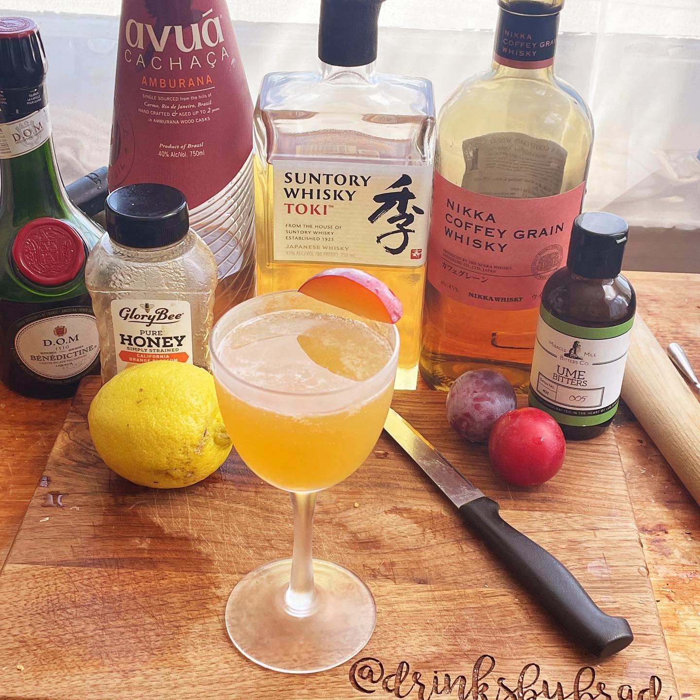 The blended Japanese malt has notes of stonefruit, orchard fruit that combine with the vanilla custard notes of the Japanese grain whiskey and the roasted tropical fruit notes in the aged cachaca to form a flavorful base that works with the honey syrup to highlight the sweet/tart notes of ripe in season plums. Fresh lemon juice helps brighten the drink and adds needed acidity while a splash of the honeyed/floral Benedictine and a dash of Ume bitters helps boost the plum and honey notes