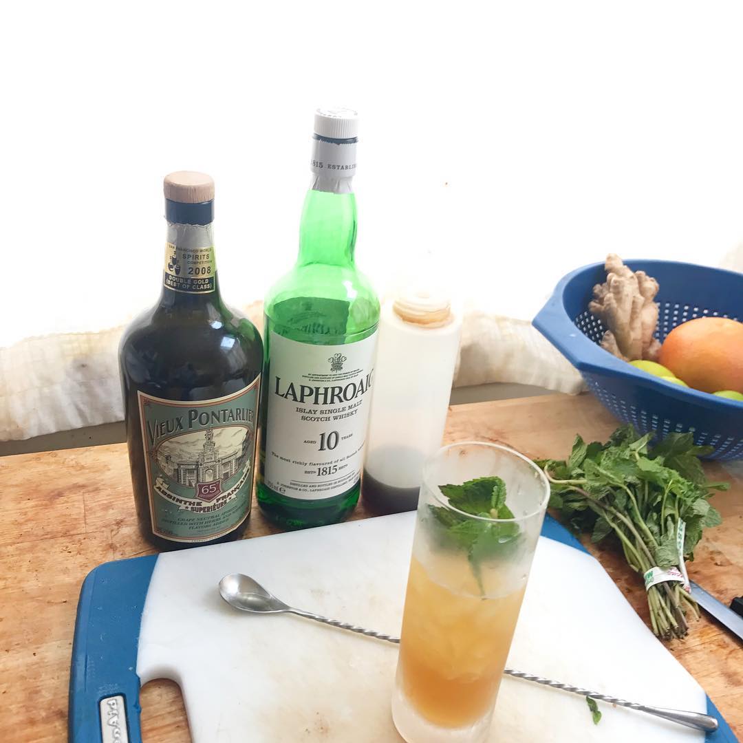 The lime tames some of the heat and a bit of the smokiness while the Laphroaig rounds out the acidity of the lime. The touch of absinthe combines with the mint garnish to give a refreshing herbal aroma