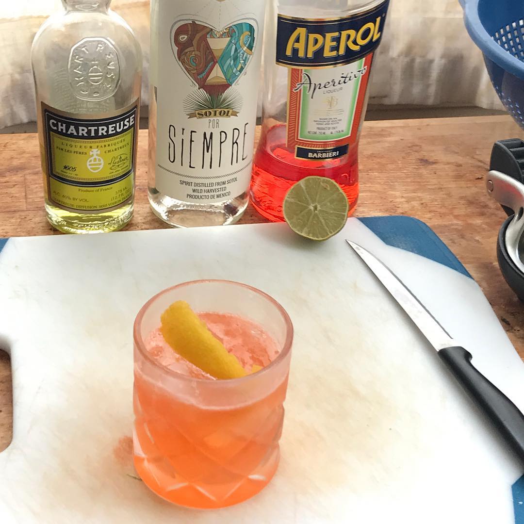 Swapping the earthier, less smoky Sotol in place of a smoky mezcal (Del Maguey Chichicapa) allows the tart notes of the Aperol and lime juice to shine while the Chartreuse adds an intriguing herbal sweetness that plays nicely with the Sotol .75 oz Sotol (Northern Mexican desert spirit from the Desert Spoon plant)