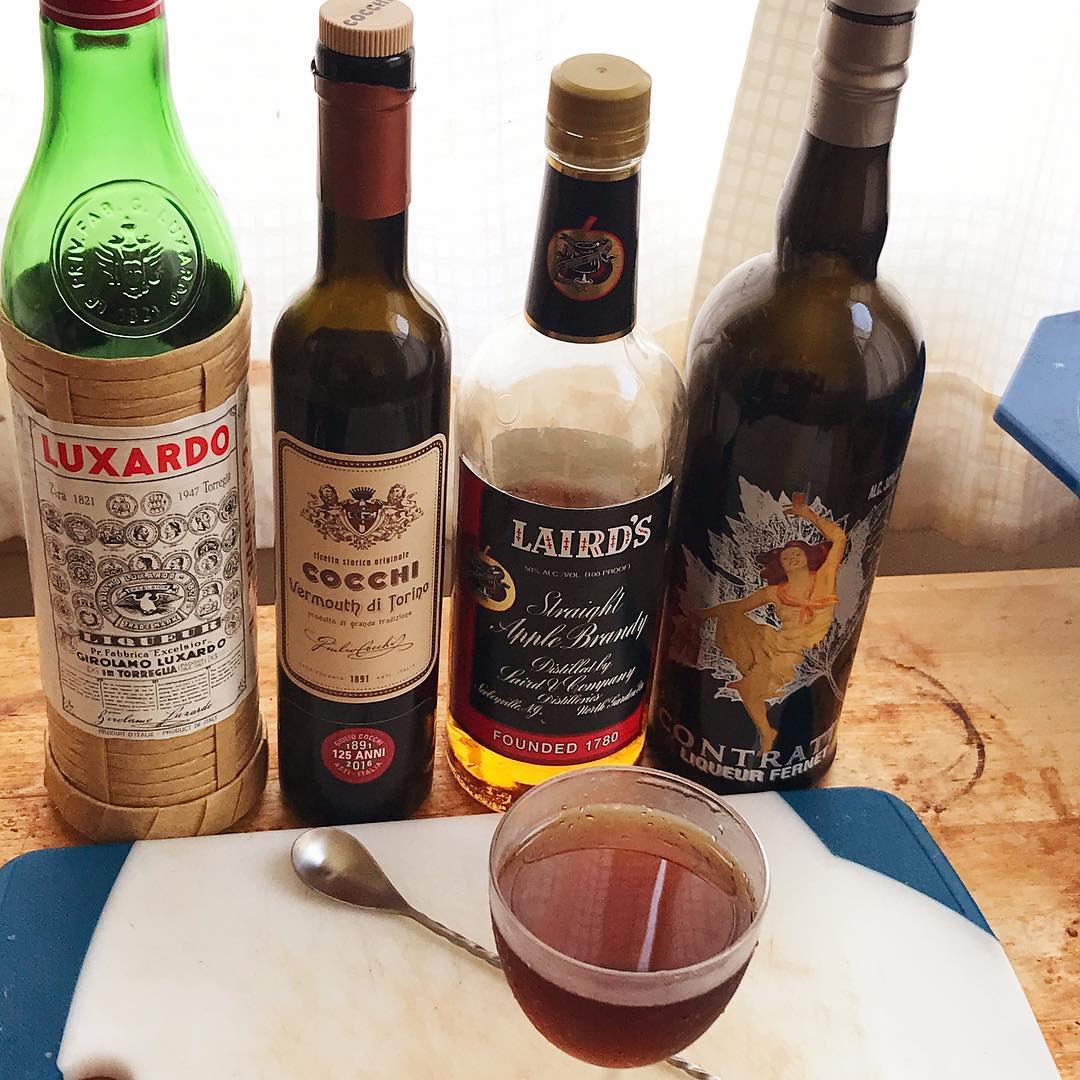 The Apple Brandy and slightly more fruity/less vanilla forward vermouth work together wonderfully while the Maraschino adds a bit of funk and the Fernet a touch of bitterness and intriguing menthol in the background