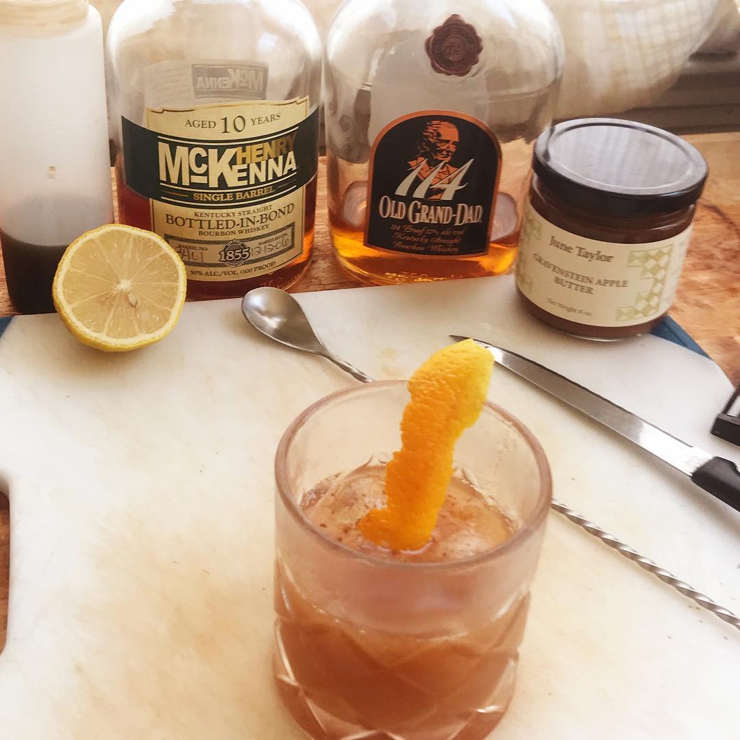 The apple butter brings cinnamon, nutmeg, and clove in addition to the deep apple flavor. This works very well with the oak, vanilla, and cinnamon in the bourbon and the brown sugar syrup while the lemon brings needed tartness that makes the drink taste more like a delicious spiced cider