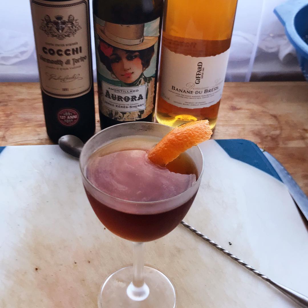 The dry, nutty Amontillado Sherry and the cocoa/spice/dark fruit notes of the Sweet Vermouth are nicely complementary while the banana liqueur adds some nice tropical fruit accents and the orange twist provides a subtle hint of juiciness. A great nightcap drink