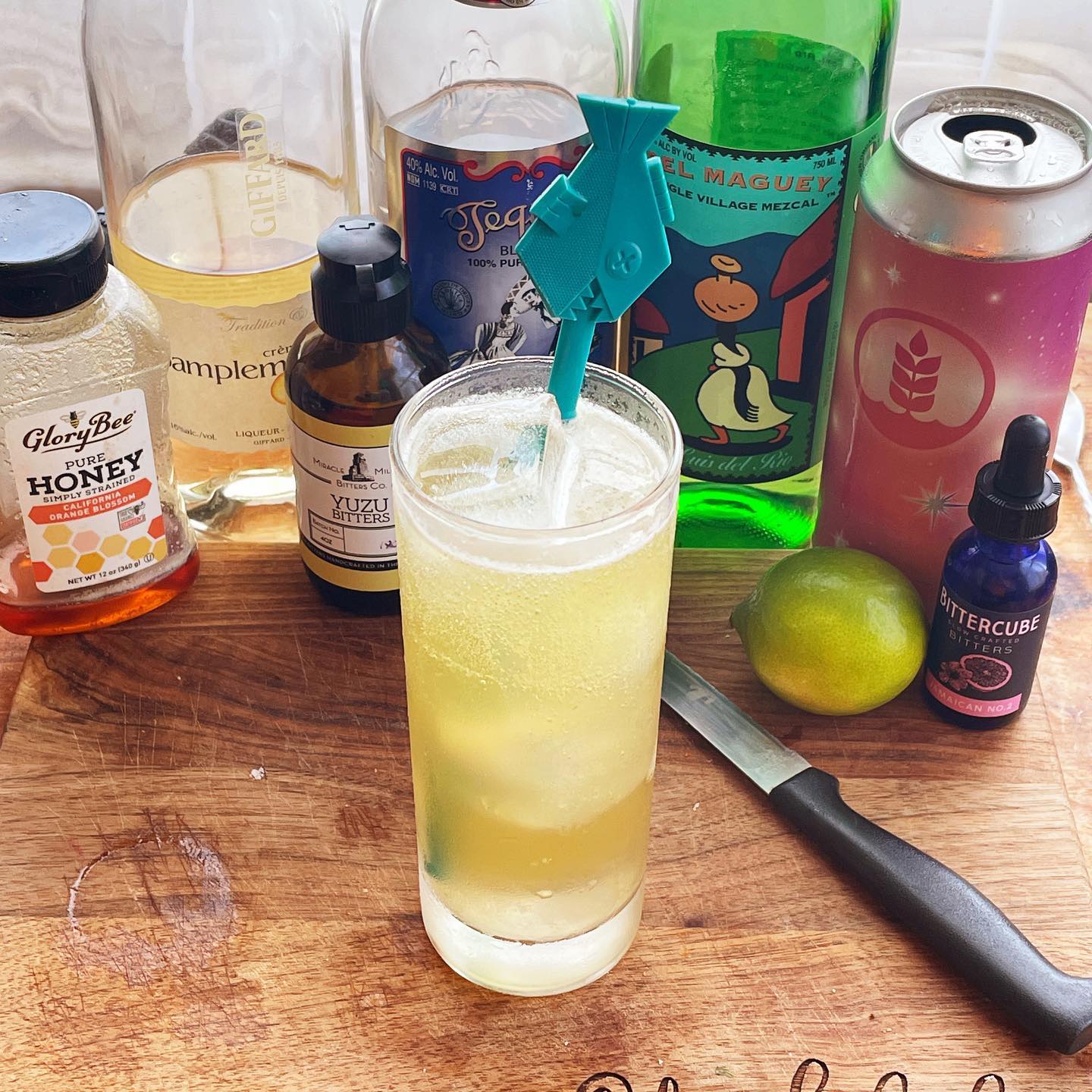 The blend of unaged Blanco tequila and mezcal provides a base with notes of citrus zest, black pepper, and subtle smoke that works nicely with the bittersweet grapefruit notes in the liqueur and the grapefruit Gose beer. The deep yet floral sweetness of the honey syrup helps lend body while fresh lime juice adds some zip and helps bridge all of the flavors. Dashes of yuzu and grapefruit and hibiscus bitters help highlight the grapefruit flavor, while the beer adds effervescence and a pinch of salt helps the flavors pop