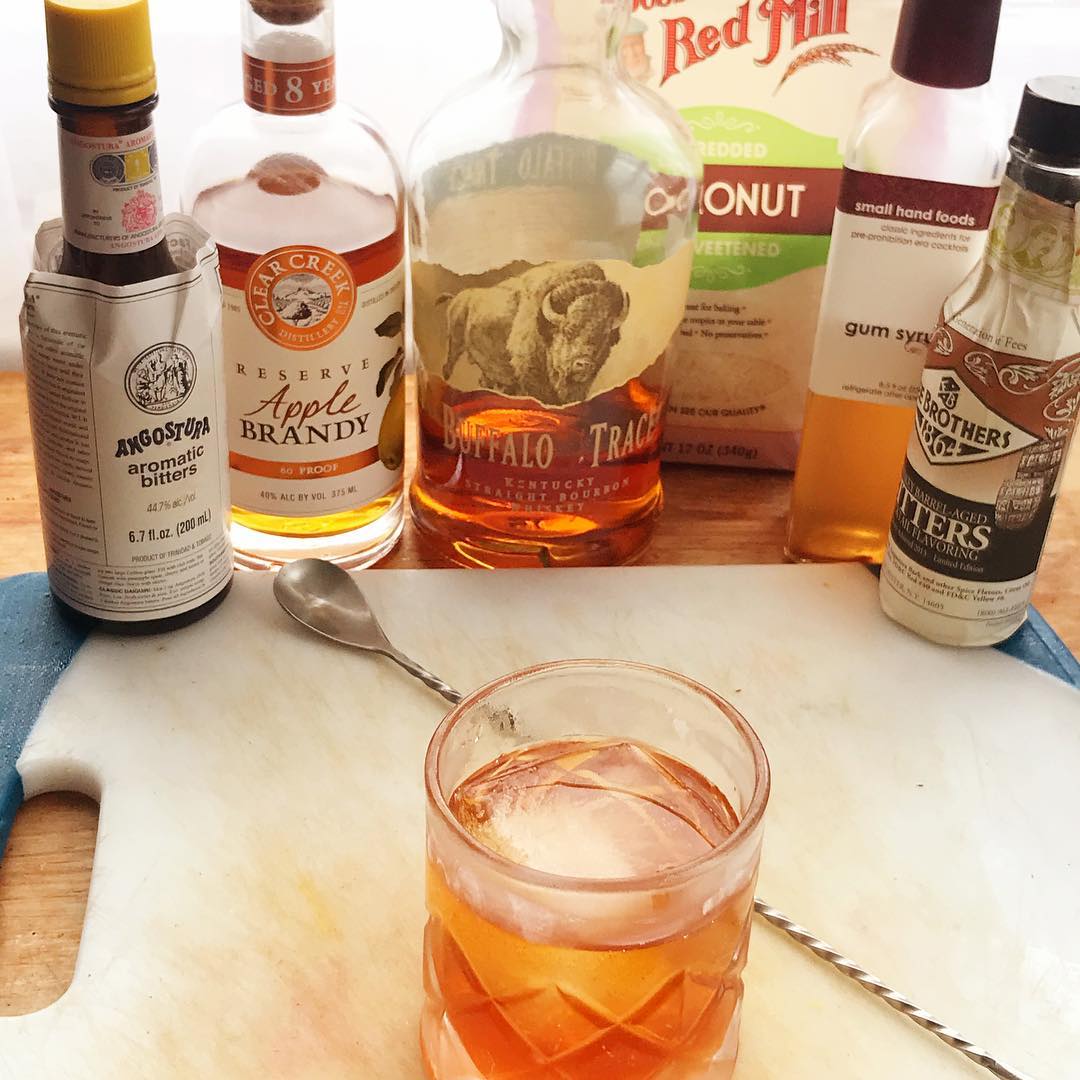 The toasted coconut adds rich body and roasted notes to the baking spice and caramel present within the bourbon while background notes of apple, allspice, clove, and cinnamon are added by a bit of apple brandy and the bitters
