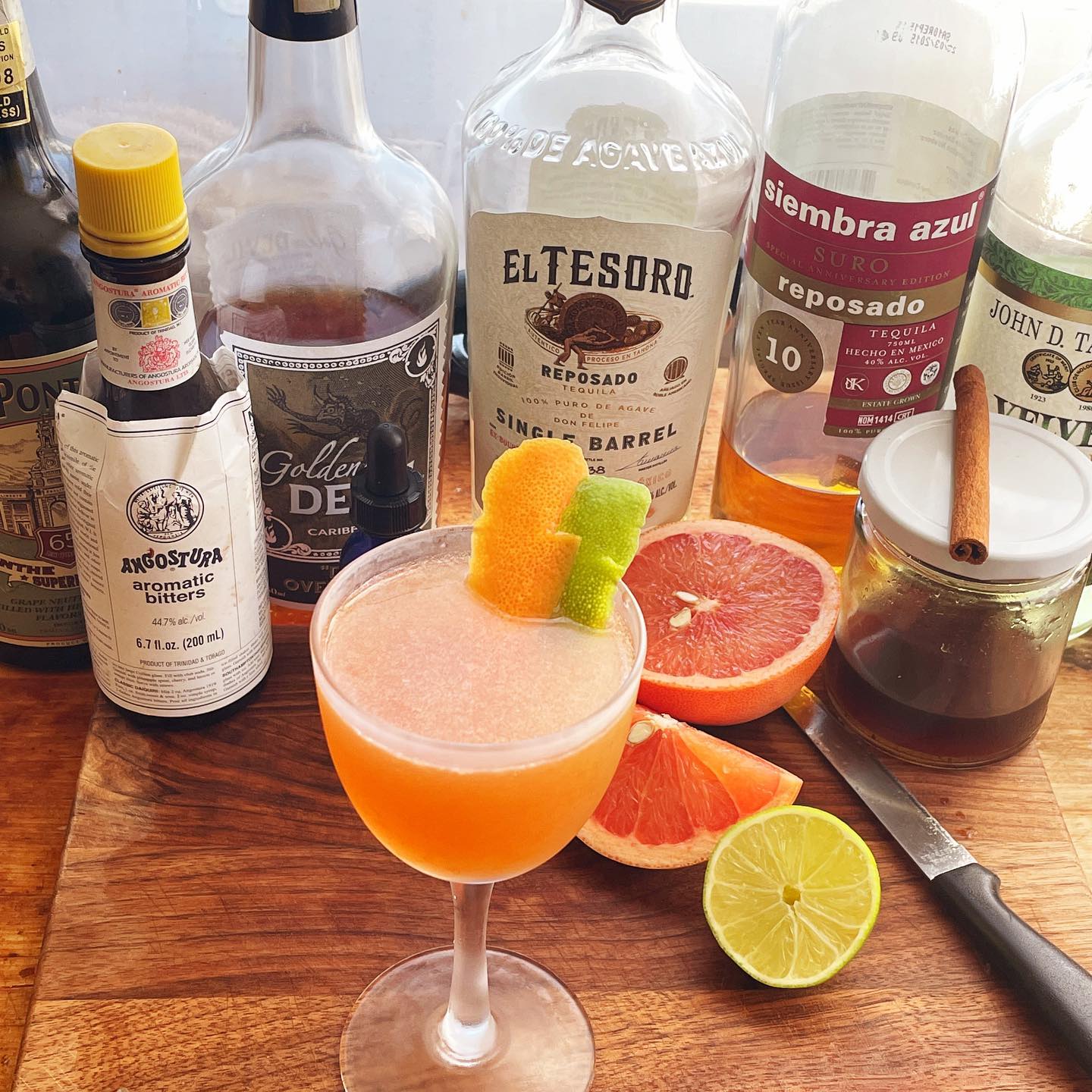 The blend of reposado and anejo tequilas provide a base with notes of butterscotch, caramelized sugar, and citrus zest that works nicely with the brown sugar/poached tropical fruit/subtle coffee notes of the Dark Overproof Rum. Cinnamon bark syrup and clove-forward Falernum add body and boost the baking spice notes while fresh grapefruit and lime juice provide a balancing tart counterpoint. Dashes of Angostura and absinthe help boost the spice notes while bridging the booze and citrus flavors