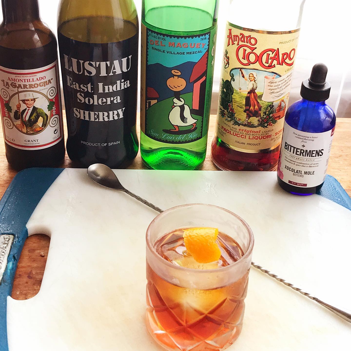 A smooth, bittersweet Old Fashioned riff from Seattle’s Barrio with notes of orange, chocolate, and smoke 🍫🍊 The mezcal has notes of citrus zest, stone fruit, and smoke that work nicely with the bittersweet cola and orange peel notes in the Amaro, the chocolate and spice notes in the bitters, and the toasted nut accents from the sherry