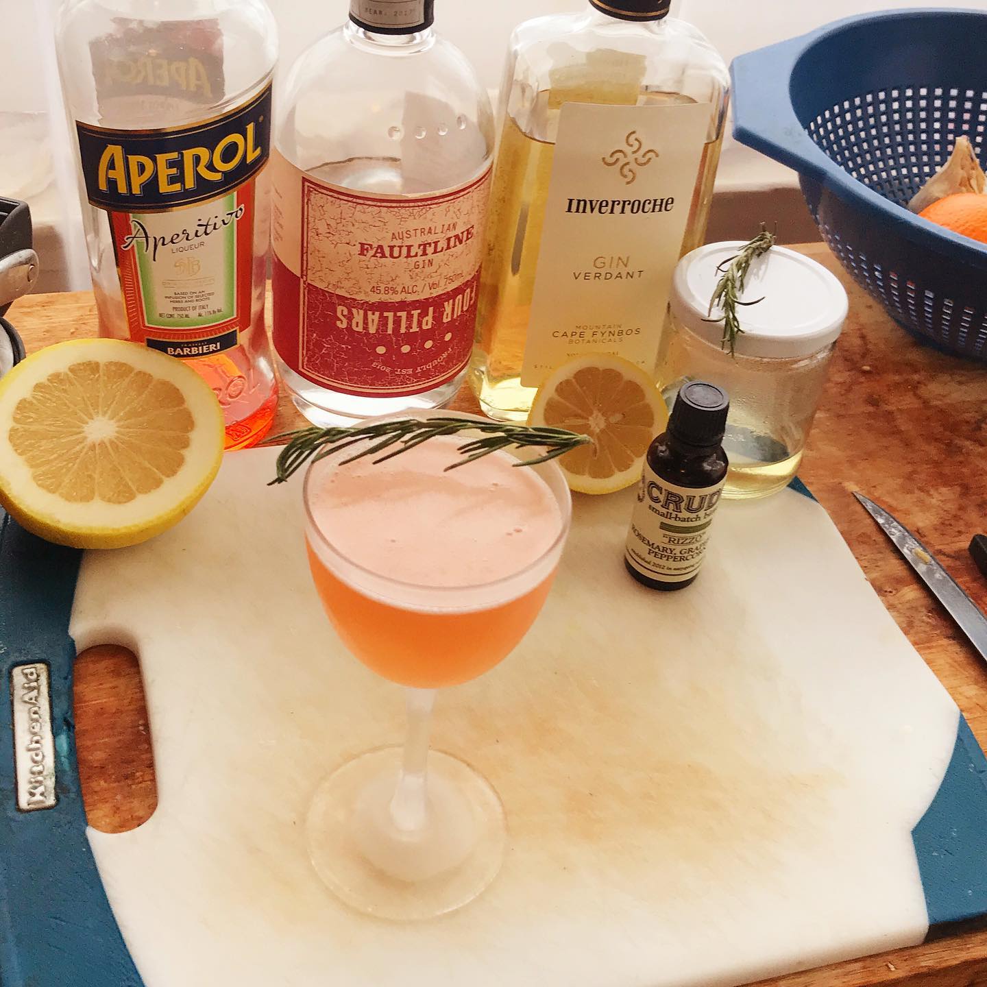 The citrus peel and juniper notes in the traditional gin and the floral/chamomile notes from the South African gin work very nicely with the savory/herbal notes in the rosemary syrup and bitters. The grapefruit and lemon add complementary bright, tart notes and the splash of Aperol works nicely to bridge the bittersweet grapefruit flavor with the other elements in the drink
