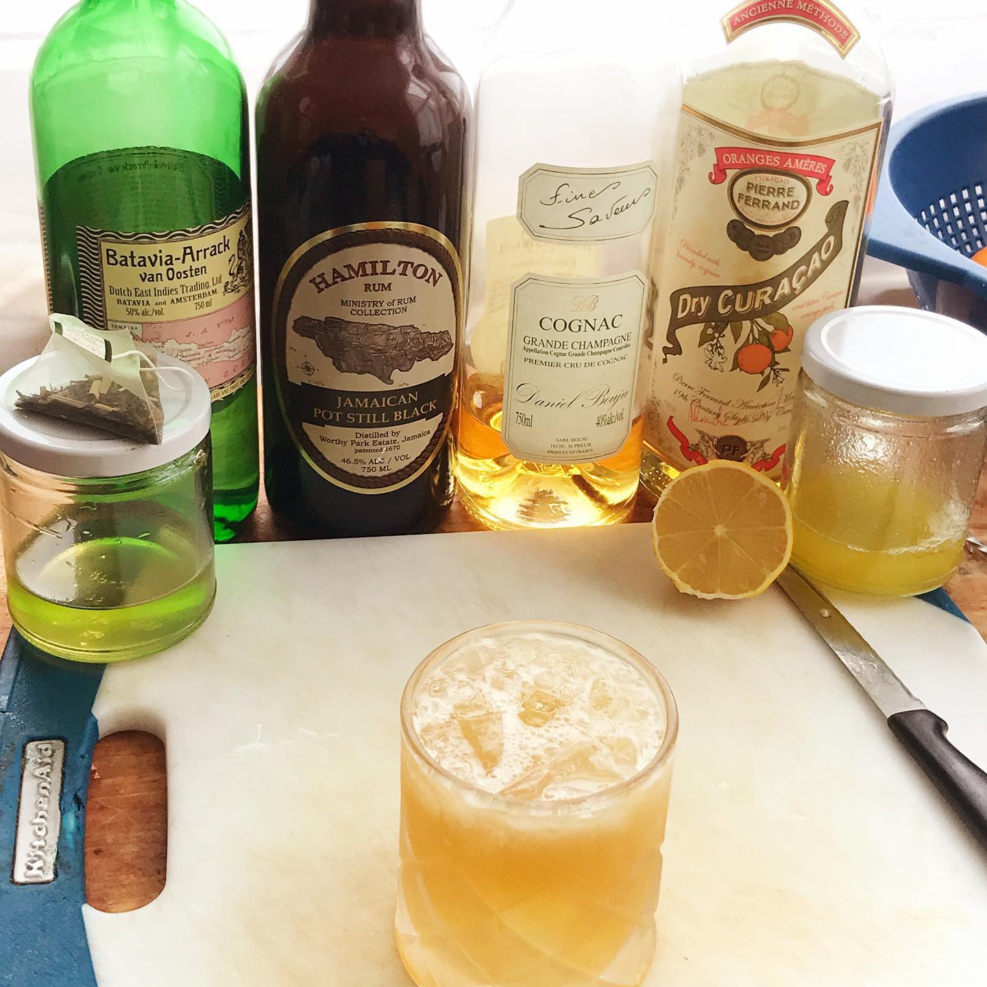 A funky, tropical riff on the tea/citrus/spirits template of the original 18th century Punch from NYC’s Shannon Mustipher 🏝🍍🍵 The ripe tropical fruit notes in the pot still Jamaican rum combine with the fruit and caramelized sugar notes in the cognac, and earthy funk of the Batavia Arrack to yield a flavorful base that allows the tropical and floral notes of the pineapple and grassy notes in the green tea syrup to shine. The orange peel notes in the Orange curacao and tart lemon juice help balance the flavors and brighten the drink