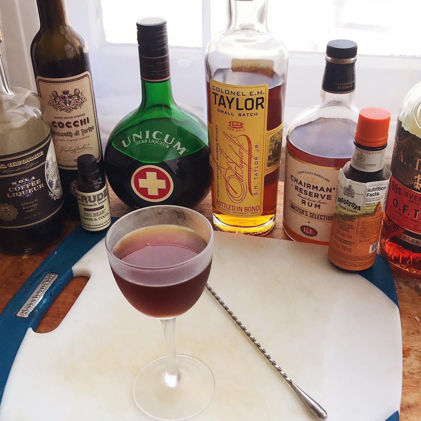 The bold caramel, vanilla, and baking spice notes in the bonded bourbon work nicely with the caramelized sugar notes in the aged cask strength rum and the coffee/dark fruit notes in the overproof dark rum to create a flavorful base. The bittersweet Hungarian Amaro adds notes of bitterness and a hint of orange peel that work nicely with the cocoa notes in the sweet vermouth while the coffee liqueur, coffee/cocoa, and orange bitters complement boost the flavors. A fantastic after dinner sipper (possibly while listening to drink’s namesake track off the excellent Otis Redding album, Otis Blue)! 1 oz Bonded Bourbon (Colonel EH Taylor is a great option; non-bonded bottle of your favorite will sub)