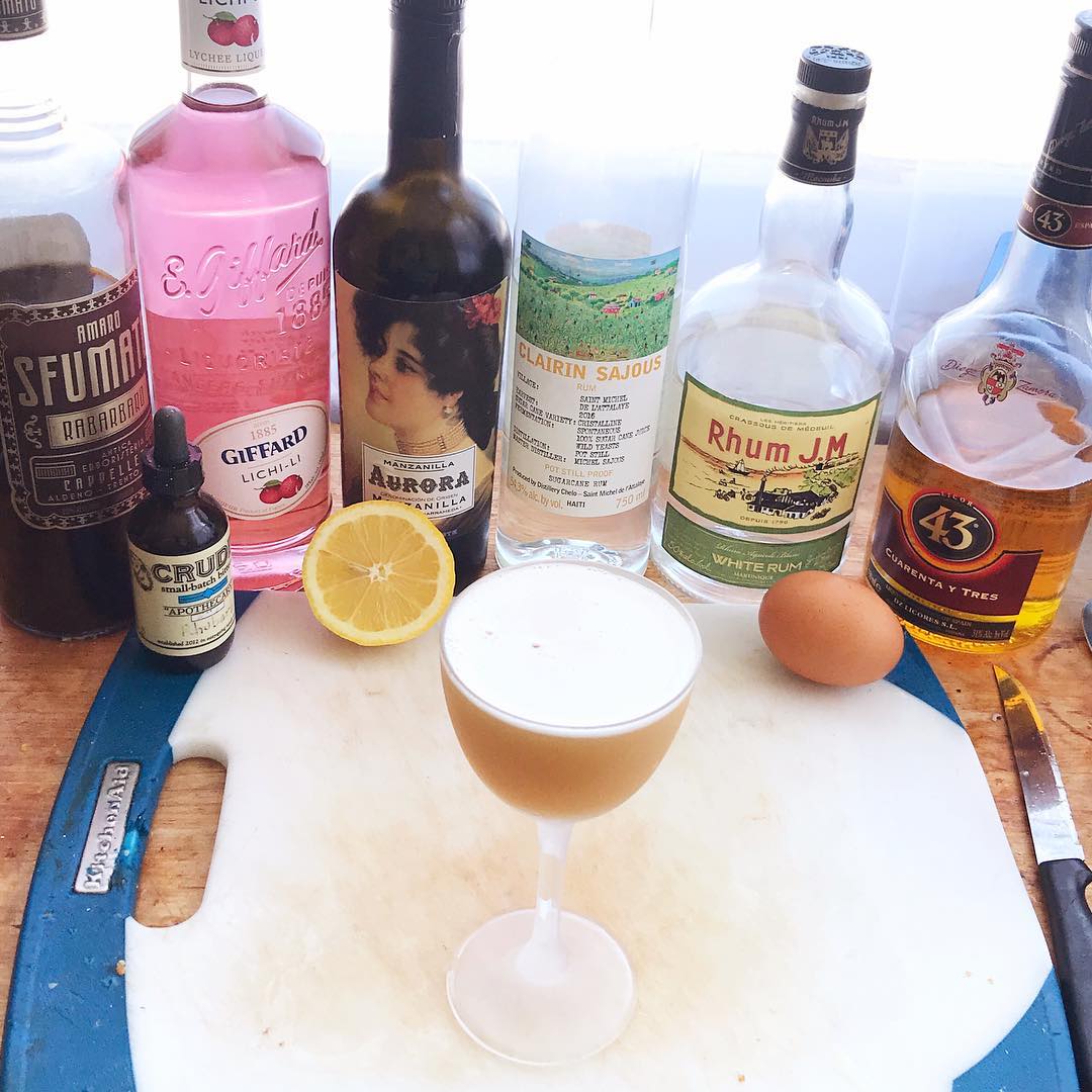 The funky Haitian clarin and Agricole Rhum have a grassy, sugarcane flavor that works well with the floral and fruit notes of the lychee liqueur while the dry, light sherry works well with the base as well as the rhubarb, vanilla, and citrus. The bit of egg white provides a bit of body