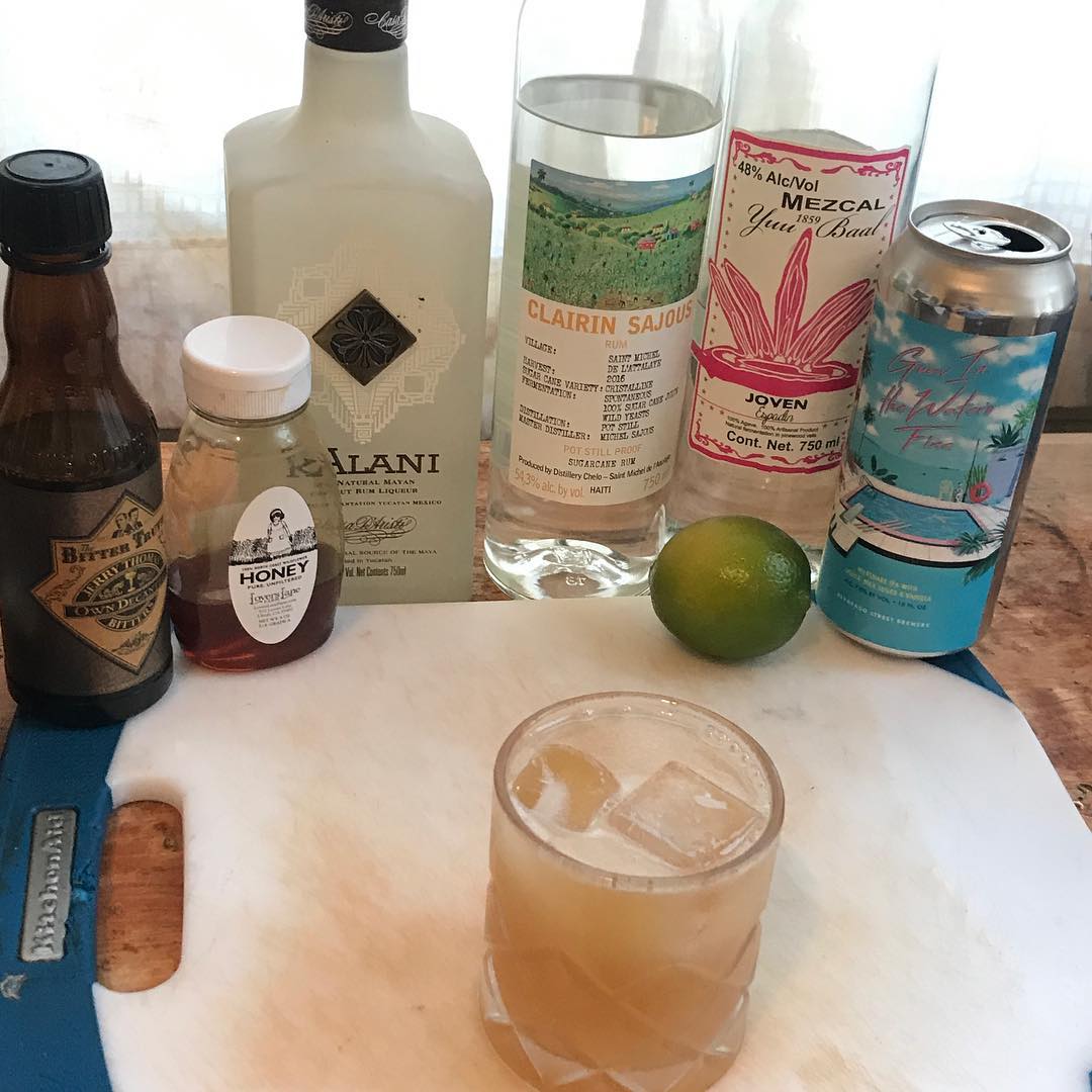 The tropical sweet/tart notes of the delicious guava IPA are backed by the grassy rum funk of the Haitian sugarcane rum while the Mezcal lends a hint of smoke, the coconut liqueur and honey combo lend a deep tropical sweetness, the bitters add a hint of Allspice and clove, and the lime brings a refreshing acidity