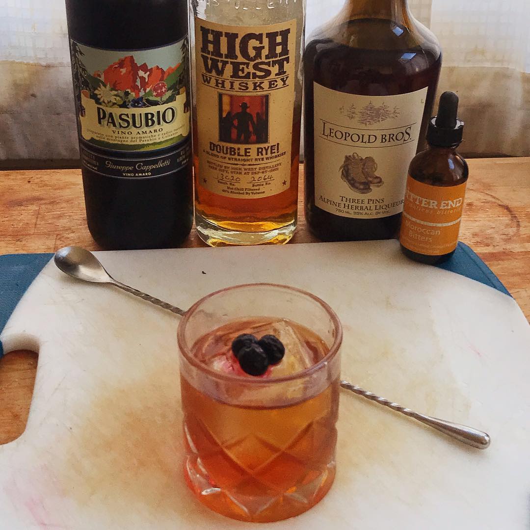 The berry and pine flavors from the Pasubio combine with the cinnamon notes and Rocky Mountain herbs and spices from the Three Pins to provide delicious accents to the spicy Rye blend from High West while the Moroccan Bitters add some spice and lemon peel notes