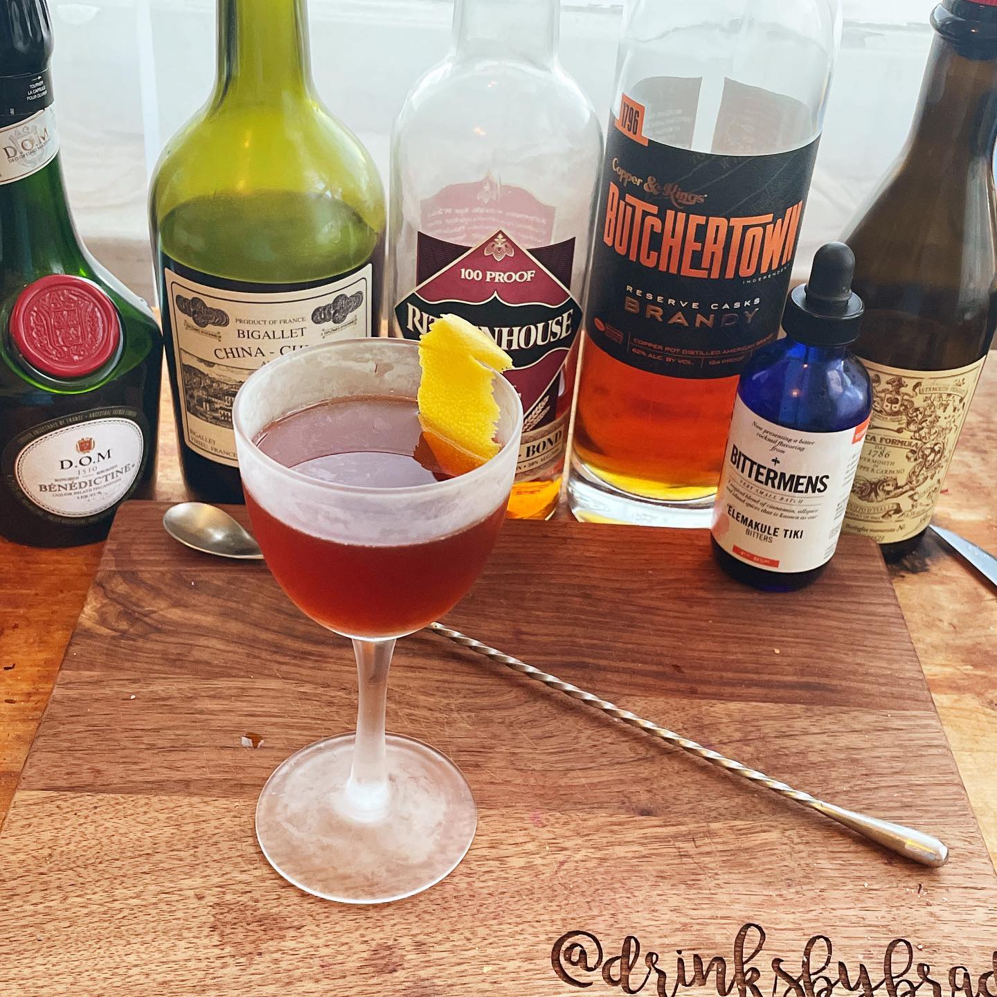 The blend of bonded rye whiskey and overproof brandy/Cognac builds a base with notes of caramelized sugar, baking spice, and some subtle fruit notes (from the brandy) that play nicely with both the bright orange peel notes and bittersweetness of the Amaro and the honey and saffron notes in the Benedictine. Sweet vermouth adds some spice and cocoa notes while a dash of bitters with notes of ginger and cinnamon help tie the flavors together