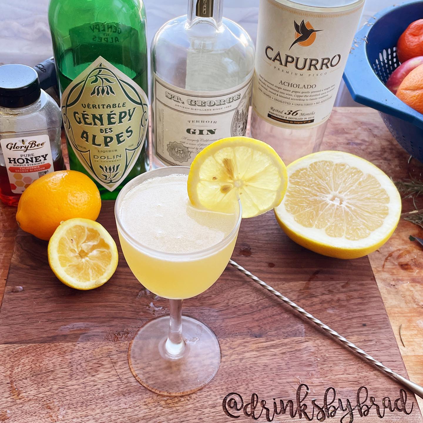 The rosemary notes in the St George Terroir gin are highlighted when paired with a splash of the Alpine herb-forward Genepy and the bright lemon and grapefruit juices. The floral notes in the South American brandy (Pisco) give a nice lightness and the honey syrup adds a deep sweetness that balances the citrus zip