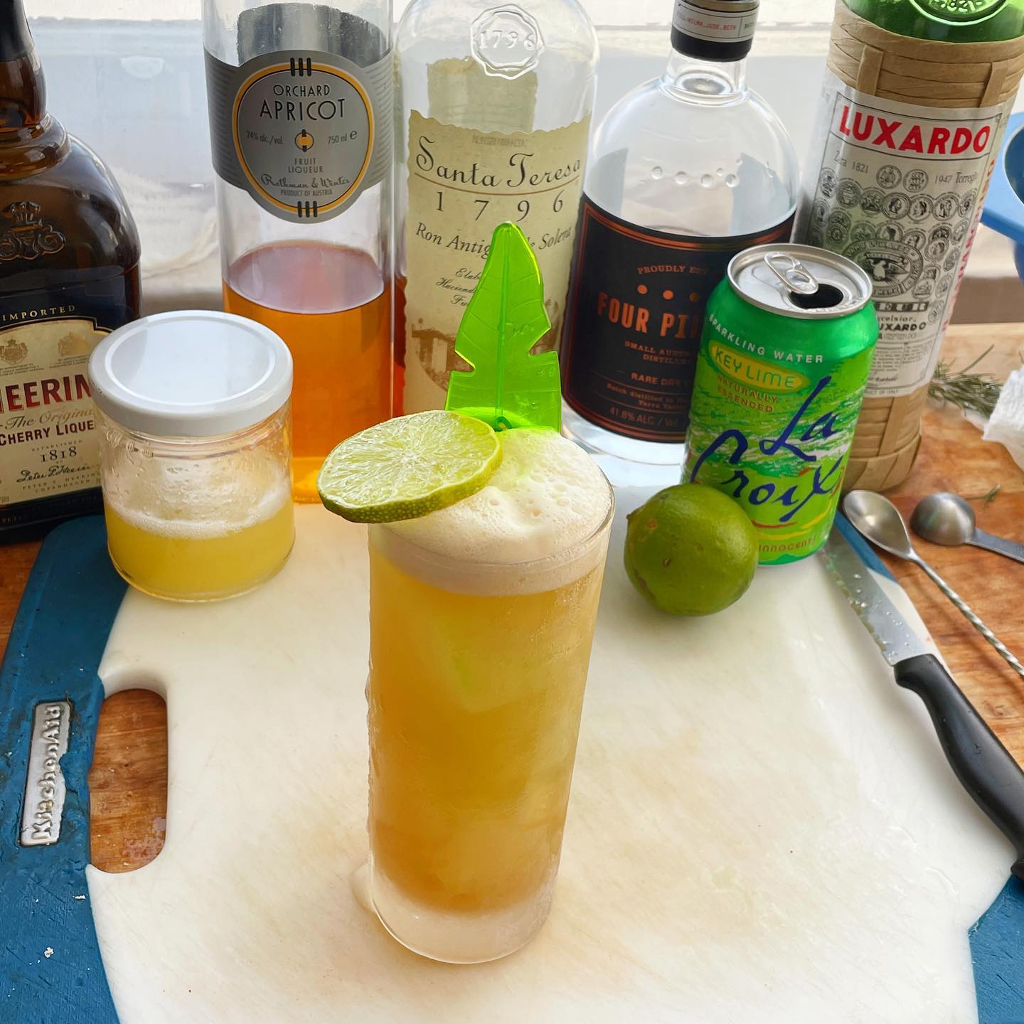 The molasses and caramelized sugar notes combine with a splash of juniper and other spices in the gin to create a flavorful base that works in harmony with the fruit flavors from the liqueurs (apricot and cherry) and fruit (pineapple and lime). A splash of soda water lengthens the drink and adds effervescence. Very refreshing and pairs well with savory food