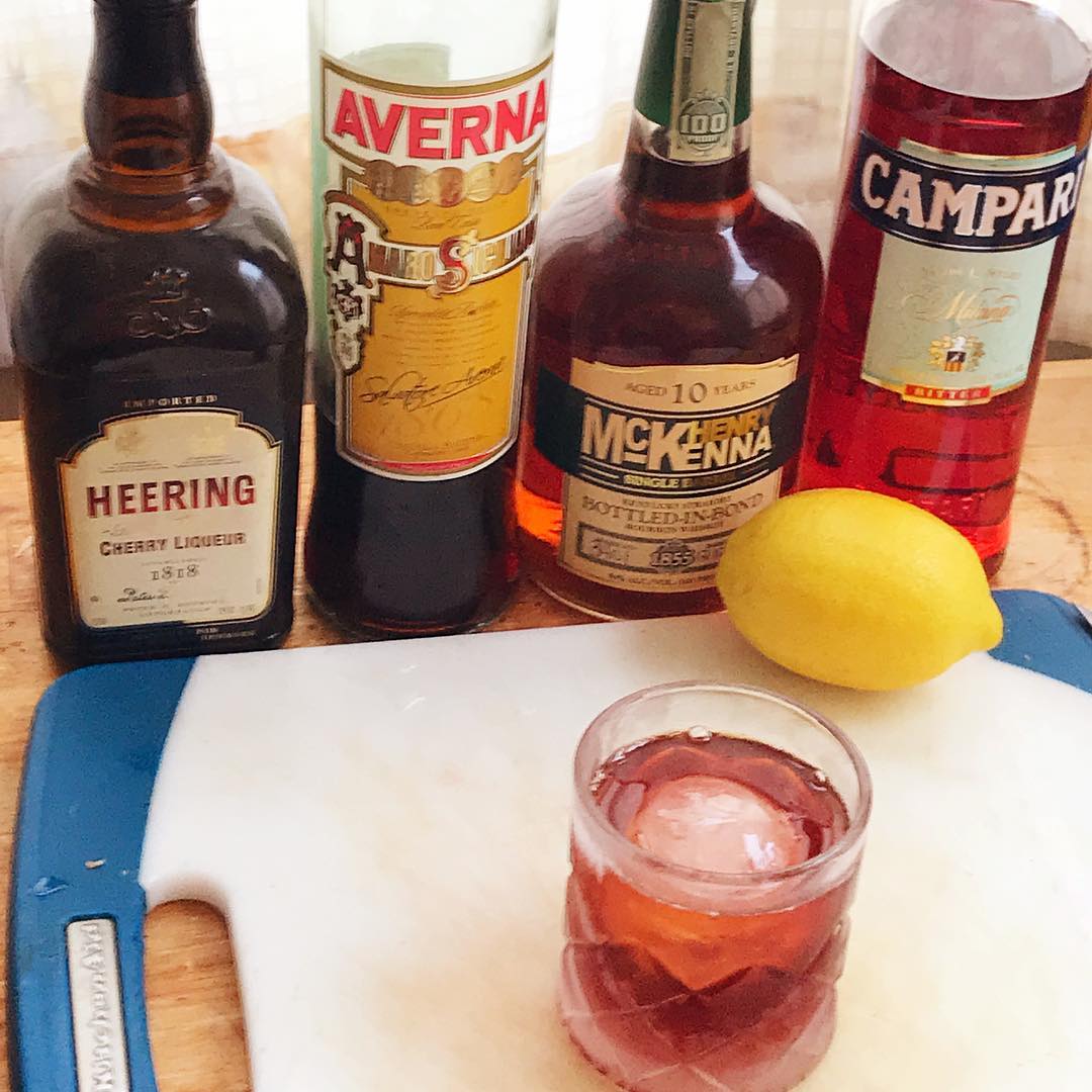 The orange peel and clove notes in the Sicilian Averna and cherry notes from the Heering work very well with the bourbon base while the bitter notes in the Campari and smidgen of lemon juice lighten things up and keep them from being too sweet