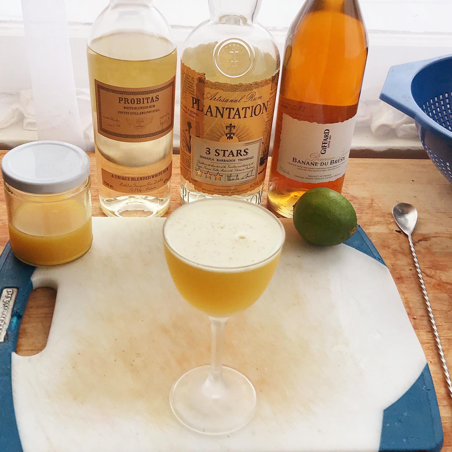 A bright, tropical Daiquiri riff from NYC’s Shannon Mustipher 🍌🍍☂️ The tropical fruit aromas and molasses flavors of the blended rum (mix of pot still Jamaican and Column still Barbados and Trini rums) provide a flavorful base that complements the banana and pineapple flavors. The lime juice adds brightness and acidity while the nutmeg garnish adds a hint of spice