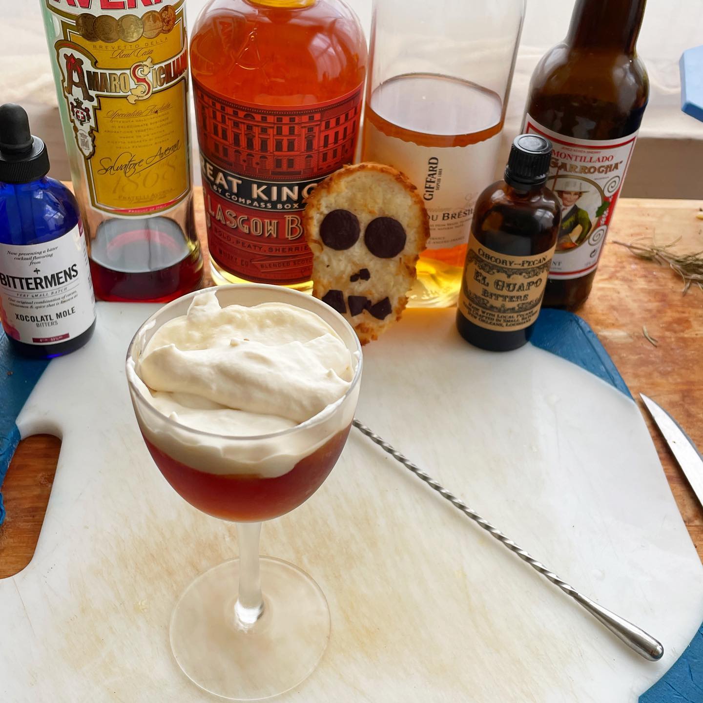 The blended scotch base has notes of honey and subtle peat smoke that work nicely with the bittersweetness and baking spice notes in the Sicilian Amaro and the nutty notes in the amontillado sherry. The banana liqueur adds decadent Bananas Foster notes and the bitters add notes of dark chocolate and nuts. The cinnamon-laced whipped cream topper lends richness and additional complementary baking spice notes. Pairs beautifully with a coconut macaroon (skull form for Halloween)