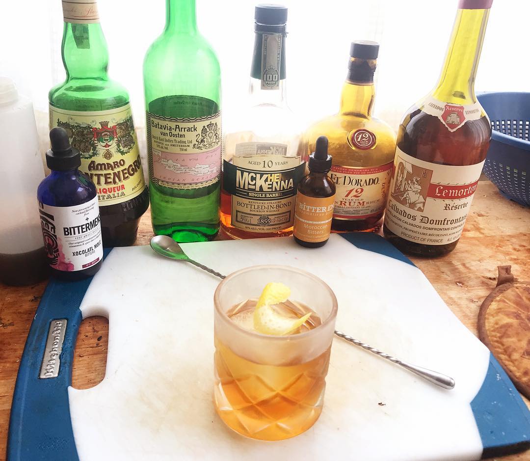 Dedicated to the inspirational, sadly departed Anthony Bourdain; RIP. This boozy, globe-trotting Old-Fashioned Riff pulls seemingly disparate spirits and flavors from across the world and shows that things can come together in delightful ways in spite of surface differences. The funk of the Indonesian Batavia Arrack mingles with the apple and pear notes in the Calvados (from Domfrontais in France) which itself integrates nicely with the spice and oak of the bourbon and the molasses notes in the Guyanese rum. The bitters show that Mexican and North African spices are complementary and the Italian Amaro lends a touch of bitterness