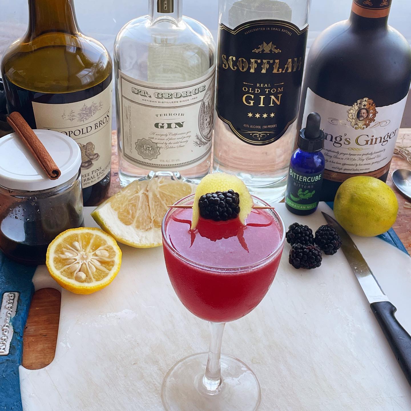 The rosemary and other herbal notes in the Terroir gin combines with the softer juniper notes in the Old Tom gin to create a base that pairs nicely with the bright citrus flavors of the fresh grapefruit and yuzu. Muddled blackberry provides a tart, deep flavor while the Cinnamon syrup combines with the ginger and allspice notes (liqueur and Jamaican Bitters) to provide spice notes that work with the splash of Alpine liqueur to unify all of the flavors. A delicious winter sipper!