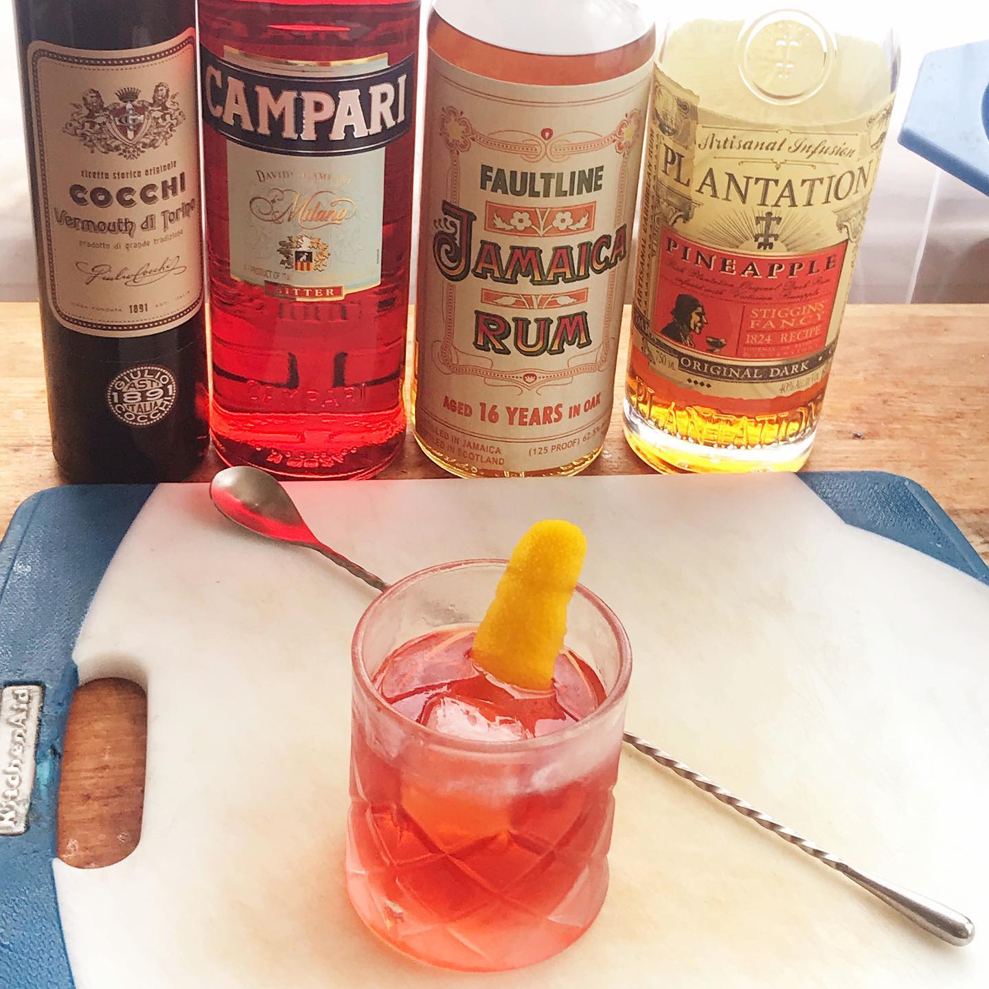 A refined, yet funky tropical Negroni that is Lost Lake’s smart twist on the Joaquin Simo modern classic 🍍🥃 The tropical fruit aromas in the Jamaican rum work together with the pineapple rum to produce some fruit-forward flavors that work beautifully with the dry grapefruit pith notes in the Campari and the spice/cocoa/dark fruit notes in the sweet vermouth