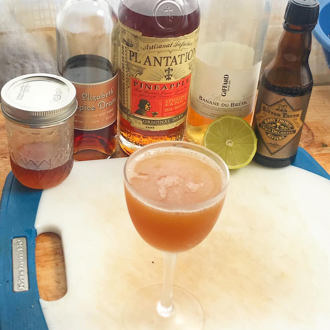 The savory and spicy jerk syrup pairs very well with the allspice notes from the liqueur and clove notes from the bitters while also nicely balancing the tropical flavors from the pineapple rum and banana liqueur and offering a rich counterpoint to the lime