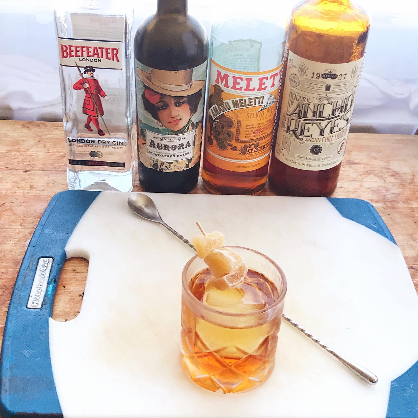 The dry, nutty Amontillado sherry works very nicely with the bittersweet, Cola notes in the Amaro to give a complex, round flavor while the small amount of gin contributes juniper and other botanical accents and the Ancho chile liqueur adds a spicy kick to each sip (low ABV, huge flavor!) 1 oz Amontillado Sherry (Bodegas Yuste, Lustau, Hidalgo all work nicely)