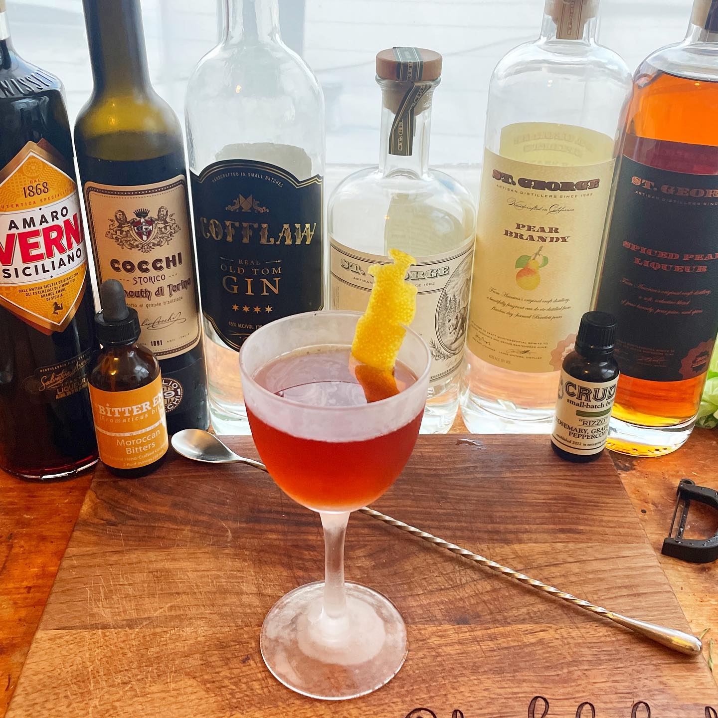 The Terroir Gin has notes of rosemary and other herbs that combine with the juniper and other botanicals in the Old Tom gin and the ripe pear notes in the eau de vie to create a base with notes of pears, herbs, and some spice that work beautifully with the baking spice, orange peel and subtle sage and rosemary undertones in the Sicilian Amaro (Averna) and the sweet vermouth. A splash of spiced pear liqueur helps boost the baking spice and orchard fruit notes while dashes of two spice/savory bitters help tie the flavors together. A delicious fall sipper!