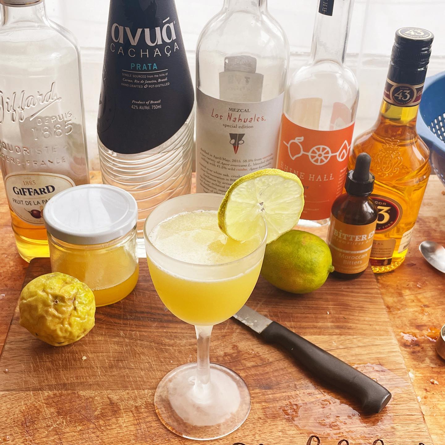 The blend of a softer mezcal and unaged cachaca result in a base with notes of citrus zest, tropical fruit, and touches of grassy sugarcane and subtle smoke that works to highlight the bright tropical notes of mango (from the eau de vie) and the sweet/tart passionfruit (from both the syrup from fresh passionfruit and a splash of the liqueur). Fresh lime juice adds some balancing tartness and acidity while a splash of vanilla liqueur and dash of Moroccan bitters bring notes of bright sumac and a touch of spice. Delightful!