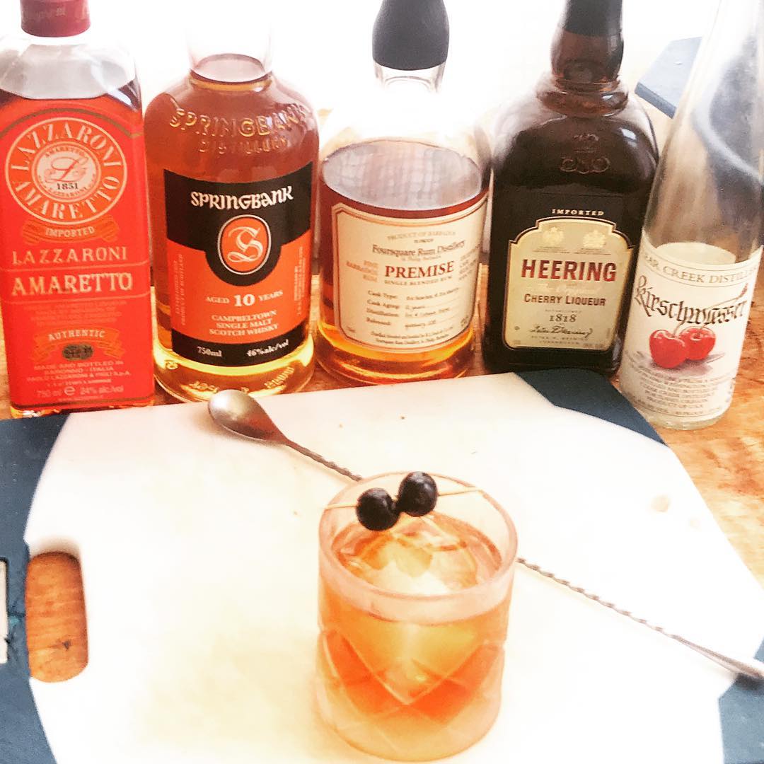The malt, peat, and almond notes in the scotch pair very well with the cherry notes from the Heering and cherry funk of the Kirsch along with the almond biscotti sweetness of the amaretto. The sherry cask aged rum adds some additional oomph and nutty sherry flavor. Tastes like some wonderful Italian cherry/almond cannoli with slight smoke notes