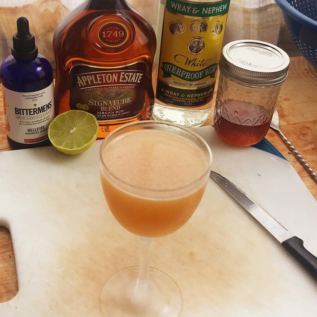 .75 oz Jerk Syrup (4 parts granulated sugar:2 parts water: 1 part mix of ground thyme, allspice, cayenne, cinnamon, black pepper, nutmeg, and salt (hit me up if you want more precise Jerk seasoning proportions), simmer on med/low heat 5 minutes and strain to remove solids)