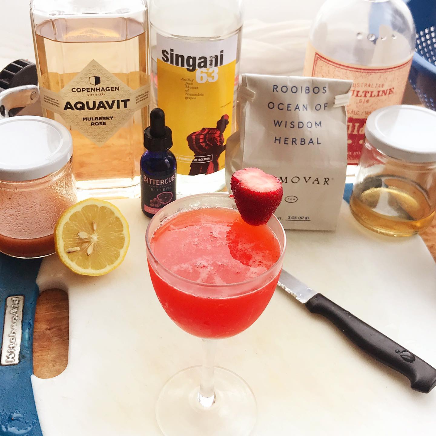 Floral Bolivian brandy infused with fruit and spice forward Rooibos tea combines with the spice and botanical notes in the aquavit and gin to create a floral, yet complex base that works as a great counterpoint to the fruit notes from the strawberry and guava syrup. Addition of fresh lemon juice brightens the drink while adding needed acidity. The cinnamon syrup adds a hint of spice that complements the tea and the hibiscus notes in the bitters help tie in the fruit and floral notes