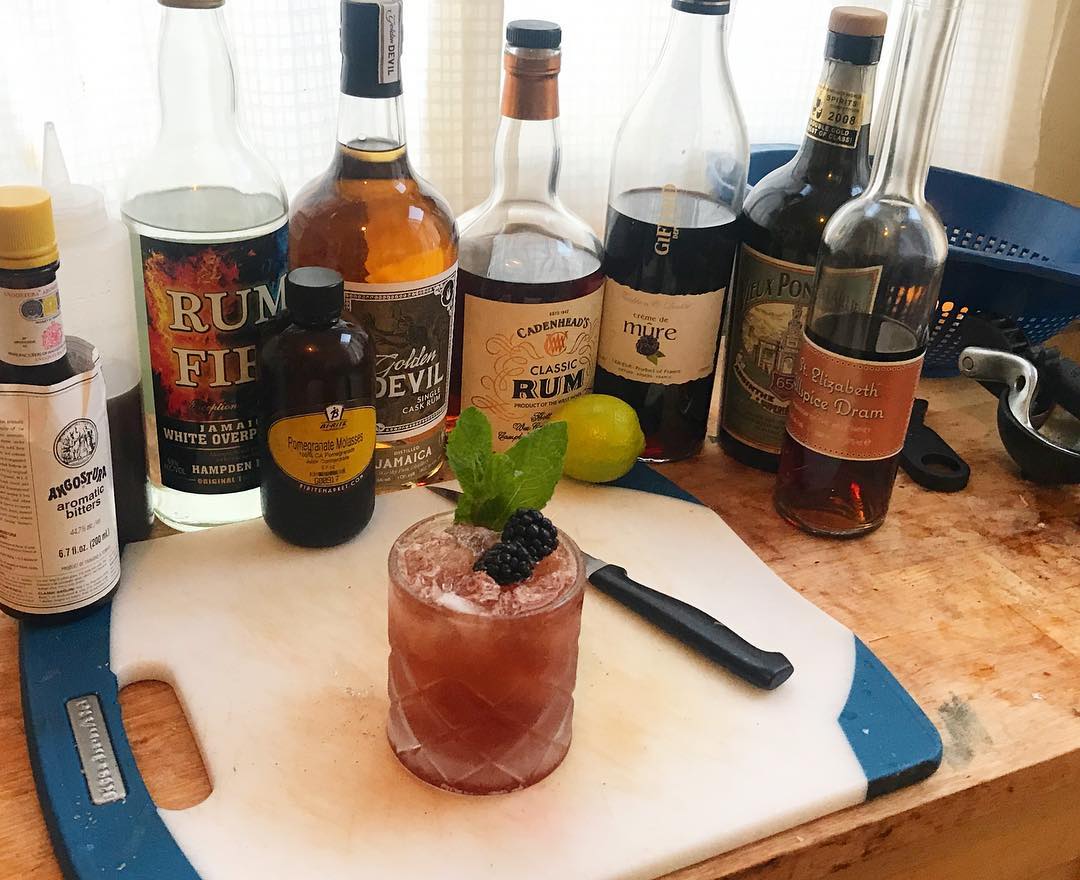 The mix of funky, ester-forward Jamaican rums pairs very well with the deep sweetness from the blackberry liqueur and bit of pomegranate. The bit of allspice adds spice and the lime brightens things