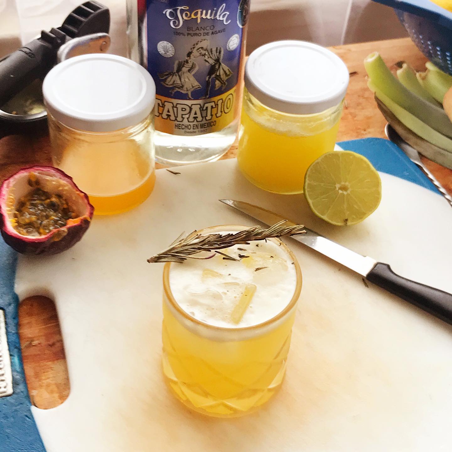 The citrus and agave notes in the Blanco tequila work nicely with the sweet/tart notes of the passionfruit syrup and the tropical pineapple juice while the lime juice and pinch of salt help balance the flavors and the singed rosemary adds a pleasant campfire aroma