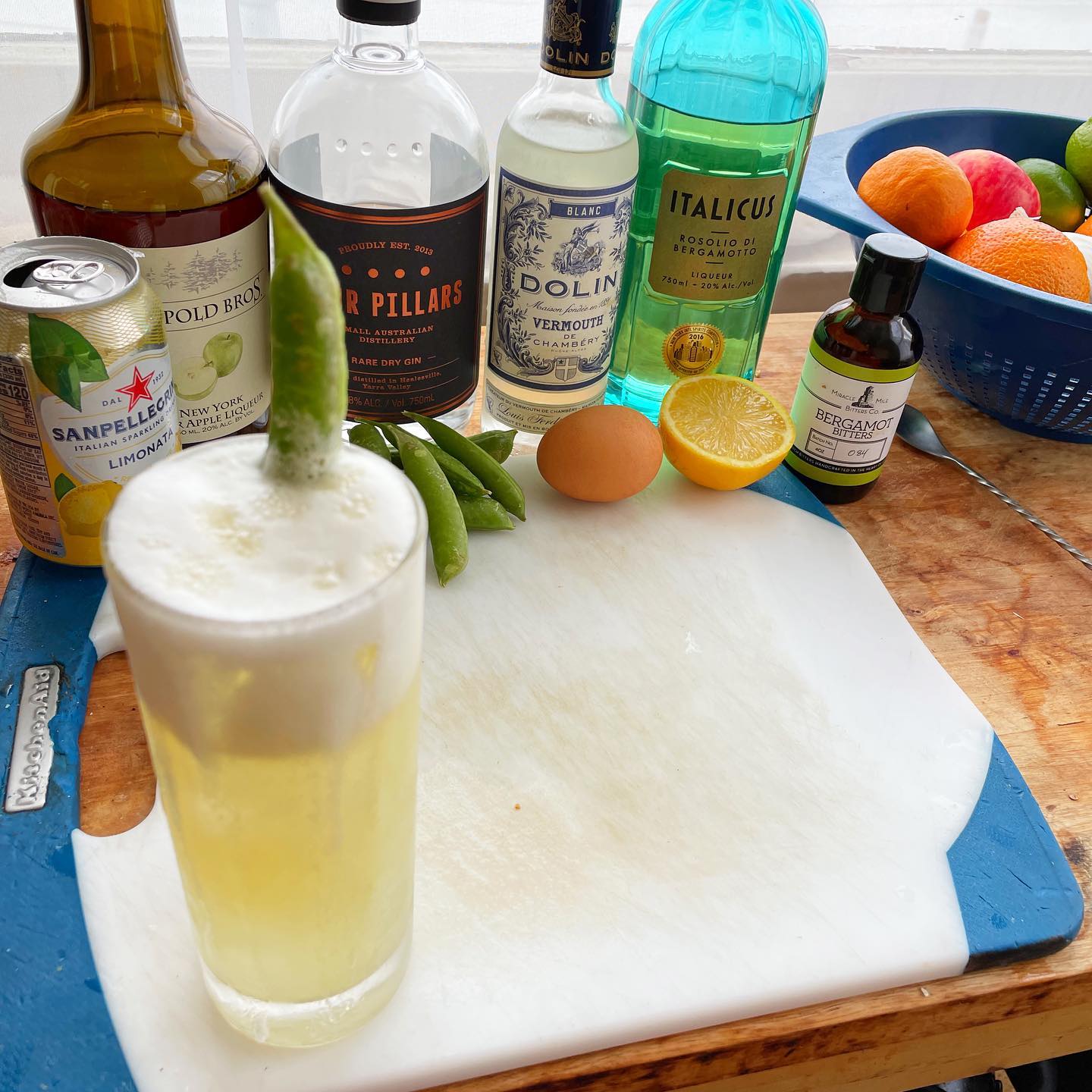 Dry shake for 10-15 seconds with no ice to incorporate egg white; add ice cubes and shake another ten seconds before straining into a chilled Collins glass with ice cubes. Top with 1.5 oz sparkling lemonade and a few drops of Bergamot bitters (Lime Bitters would be a good sub). Garnish with a spring pea