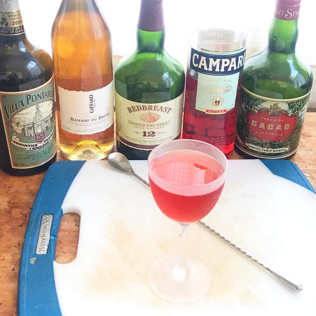 A tropical variation on a Boulevardier from NYC’s Dead Rabbit with intriguing notes of banana and cocoa 🍌🍫 The bittersweet, juicy notes of the Campari (or other aperitivo of choice) helps balance the richness of the roasted banana and cocoa notes in the liqueur. The cereal grain and honey notes of the aged Irish Whiskey provides a nice base for these flavors and the bit of absinthe brightens up the drink