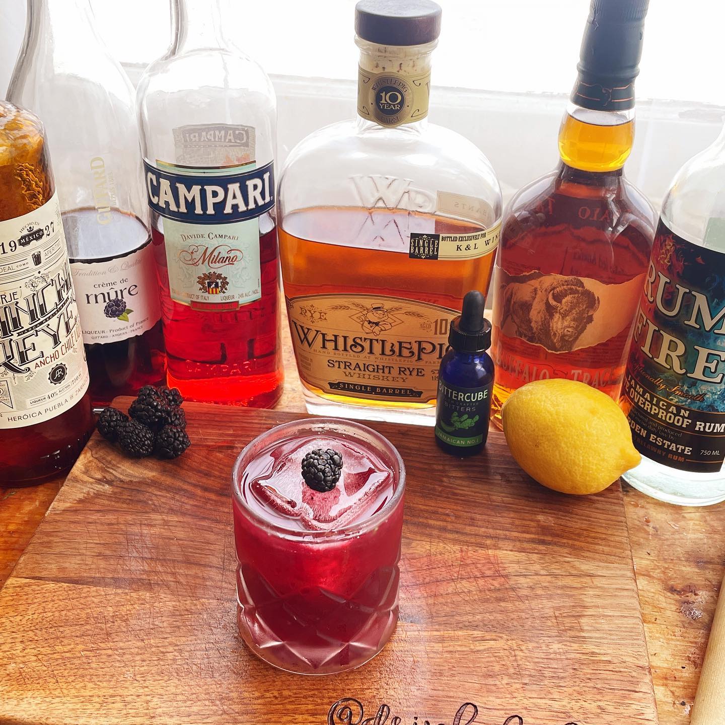 The blend of overproof rye and bourbon results in a base with notes of caramelized sugar, vanilla, and baking spice that complements the deep sweetness of the blackberries (muddled fresh and the Creme de mure) and the bright, tart lemon juice helps balance the drink. Splashes of Campari and ancho chile liqueur add complementary touches of spice and bittersweet flavor that combine with the allspice and ginger notes in the bitters to lend depth. A float of overproof Jamaican rum gives punches up the fruity aroma while adding some funky depth