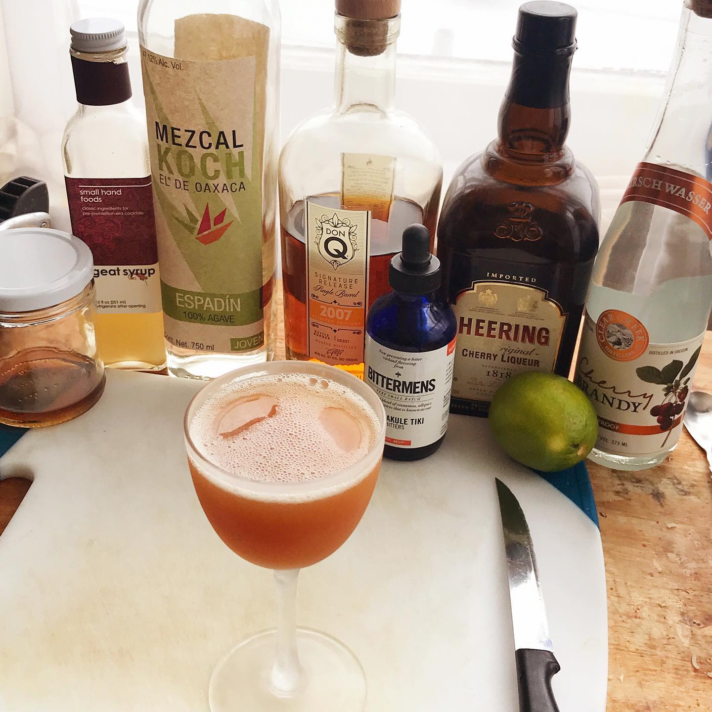 A delightful, flavorful drink from Fanny Chu of Brooklyn’s Donna that sits at the intersection of a margarita, daiquiri, and cherry-lime rickey 🍒🥃 The caramelized sugar notes in the aged rum and smoke/citrus zest notes in the mezcal provide a firm foundation for the flavors of cherries (from the Eau de vie and liqueur), almond (Orgeat), citrus (lime juice), and a bit of baking spice (Tiki Bitters). A delicious and nuanced sip