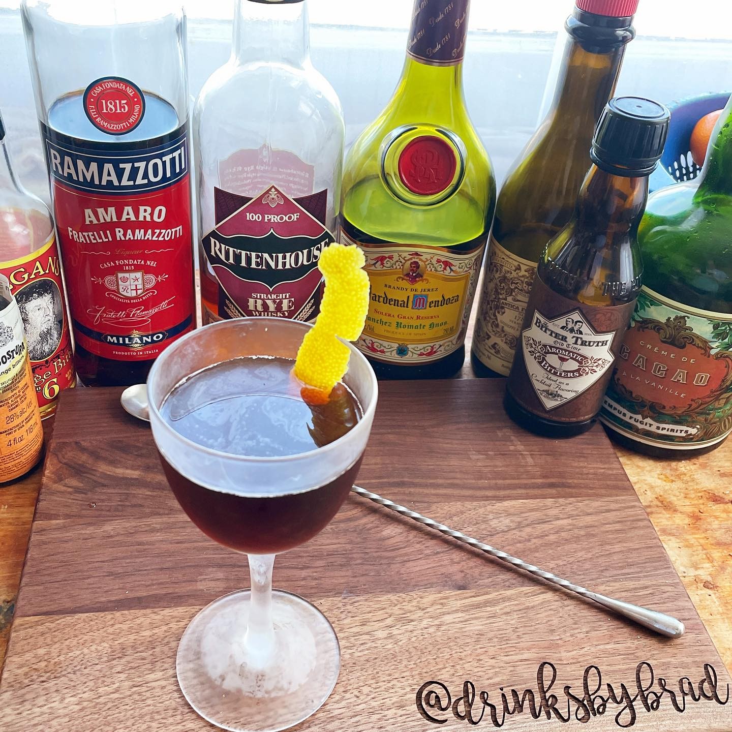 The bonded rye whiskey contributes notes of baking spice and rye bread that work with the raisin bread notes in the aged Spanish brandy to create a flavorful base. The sweet vermouth and splash of Creme de cacao combine with the bittersweet Amaro to lend a dark chocolate accent while the orange bitters work with the citrus peel notes in the Amaro and vermouth to lend a hint of orange