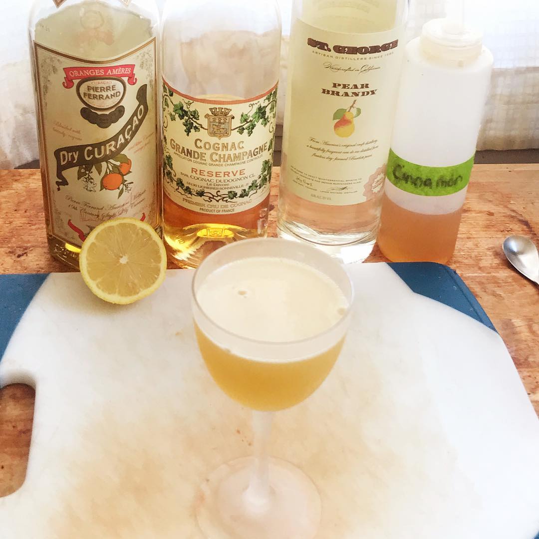 A delightfully balanced Sidecar variation from Devon Tarby of LA’s Normandie Club and Walker Inn that is overflowing with fall flavor 🍁🍐 The fruit and oak notes of the cognac are enhanced by the delicious ripe fruit flavor of the pear brandy and are complemented by the cinnamon syrup. The orange liqueur adds a juicy sweetness that is balanced by the tart, zippy citrus to result in a super flavorful drink that deftly balances acidity, sweetness, booziness, and flavor