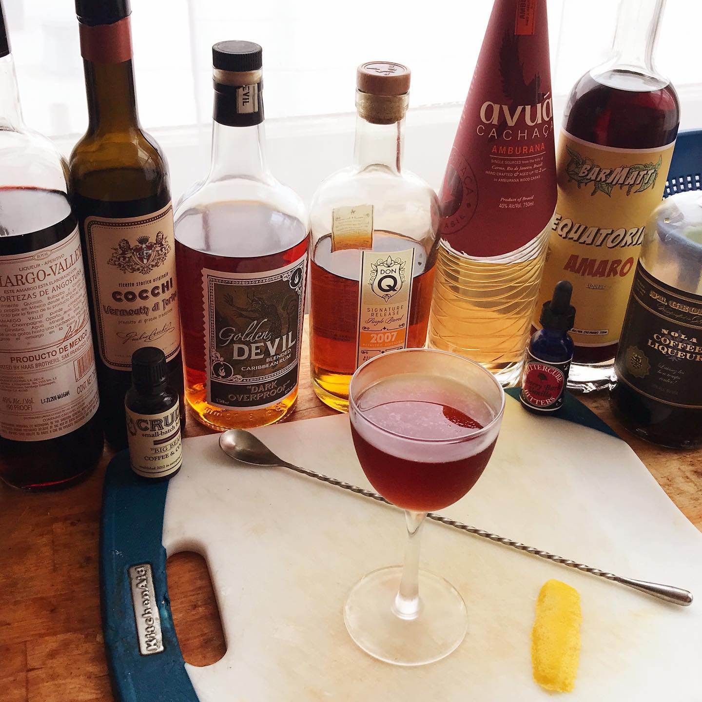 A bold, bittersweet Rum Manhattan riff with hints of cocoa, cinnamon, cherry, and coffee 🍒☕️🍫 The blend of Aged Column Still rum, Overproof pot still rum, and cachaca leads to a base with notes of brown sugar, molasses, coffee, red fruit, and hints of baking spice. The black pepper, clove, and five spice notes in the Equatorial Amaro, Cherry/coffee notes in the bitter Mexican amaro, and cocoa/spice notes in the vermouth lend complementary notes. A splash of coffee liqueur and the bitters boost the notes of coffee, cocoa, and cherry