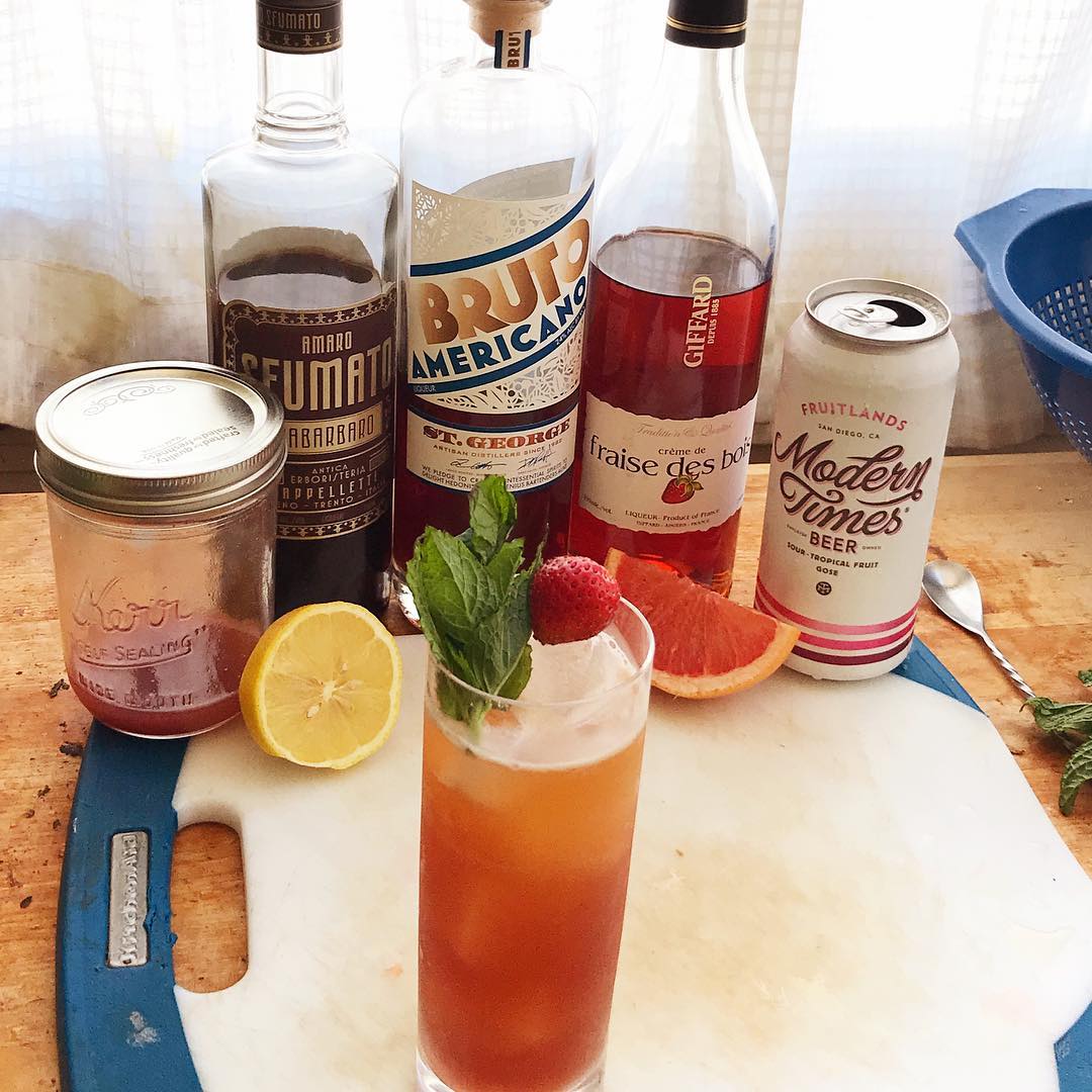 Campari (or your favorite red Aperitivo) is an excellent foil for berry flavors and rhubarb (from both a rhubarb-juice containing syrup and a smoked rhubarb Amaro) also complements these flavors. Citrus and Sour Beer with passion fruit notes bring tartness and bubbles and a bit of mint brings a pleasant aroma .75 oz Aperitivo of Choice (Campari/St George Bruto/Leopold)