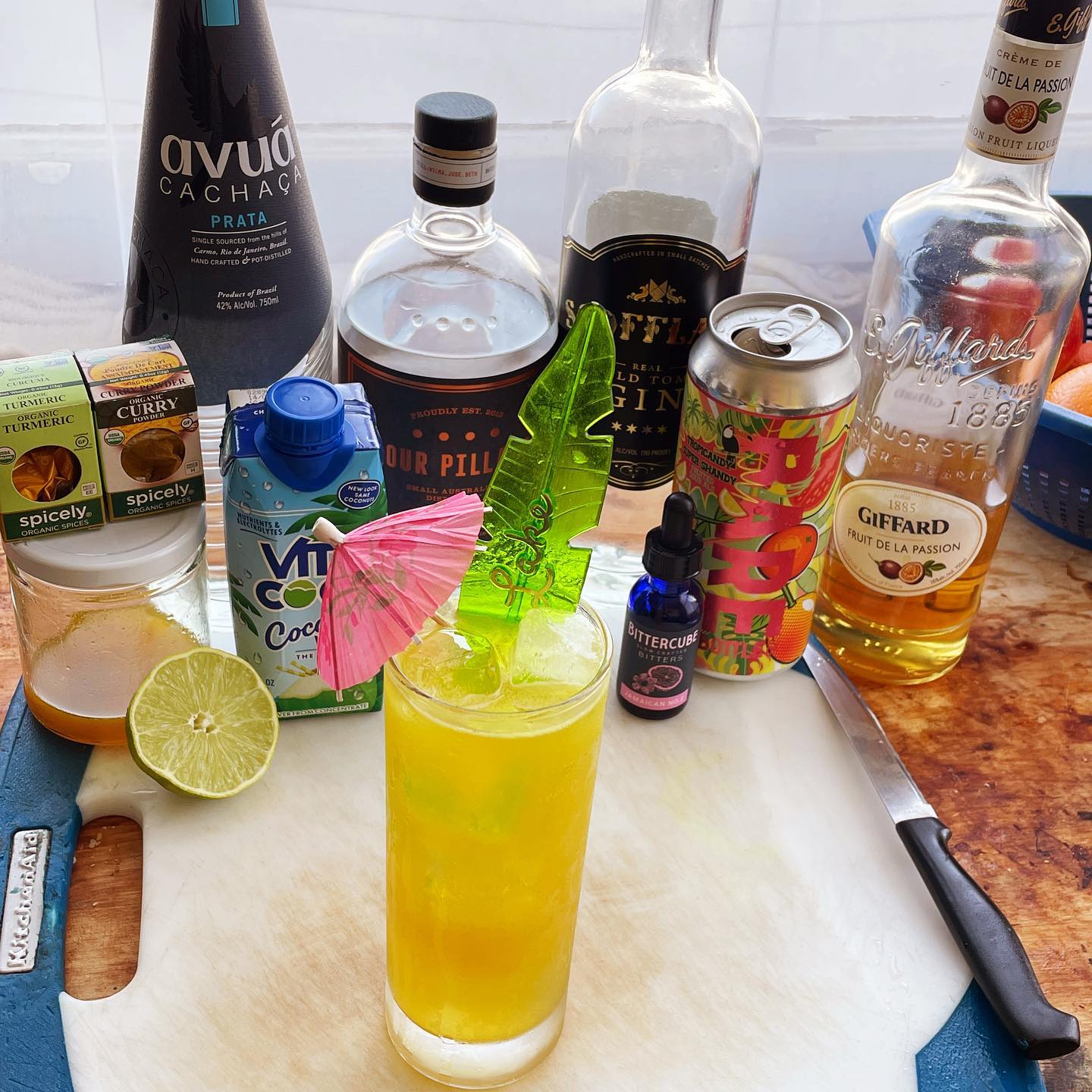 The juniper and other botanicals in the blend of gins works nicely with the savory/sweet curry-turmeric cordial to provide a substantial backbone that complements the tropical fruit flavors in the fruited sour beer, passionfruit liqueur, and unaged cachaca. The tart lime juice helps balance the acidity while the coconut water lengthens the drink. The bitters add a bright, floral note. Incredibly refreshing!